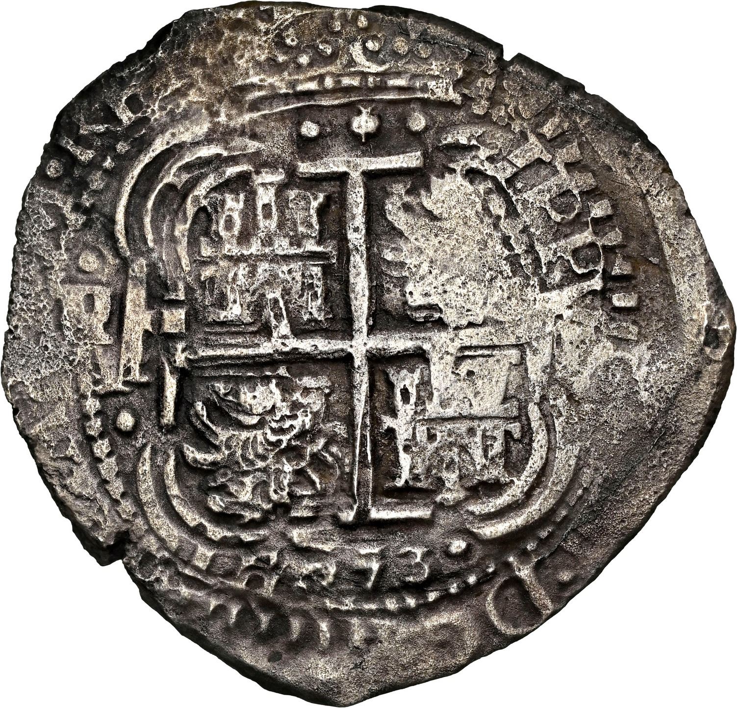 BOLIVIA, Potosí, cob 8 reales, 1653 E, •PH• at top, •pomegranate• above cross, NGC AU details / saltwater damage (Shipwreck Blue Label), ex-Zbar. S-P37a; KM-21; Cal-1503. 23.97 grams. Choice full pillars-and-waves and cross-lions-castles, all three dates, small areas of light surface corrosion, darkly toned fields, variety II-ba.y1 in Mastalir. Pedigreed to the Jack Zbar Collection (stated on label). Recovered from: Maravillas, sunk in 1656 off Grand Bahama Island