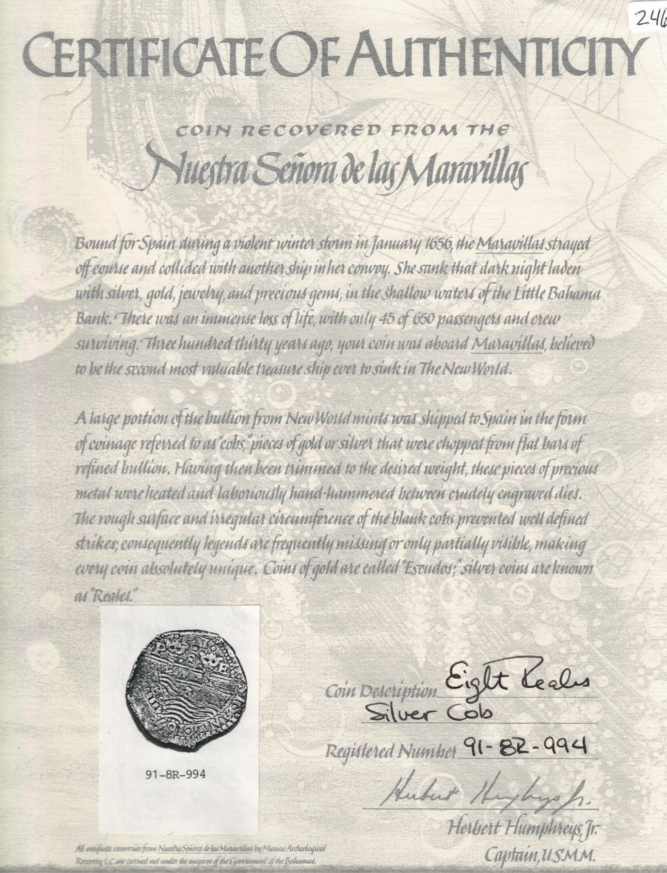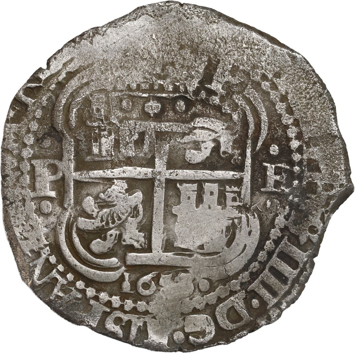 BOLIVIA, Potosí, cob 8 reales, 1653 E, •PH• at top, •pomegranate• above and 1653 date below cross, ex-MAREX. S-P37a; KM-21; Cal-1503. 26.78 grams. Choice full cross-lions-castles with full four-digit date below showing dot to right and the initial digit I punched over a left-hand dot (a variant of Mastalir II-bb.z in transition from y2), full but doubled pillars-and-waves with two more dates, light toned, practically corrosion-free. With original MAREX certificate 91-8R-994. Recovered from: Maravillas, sunk in 1656 off Grand Bahama Island