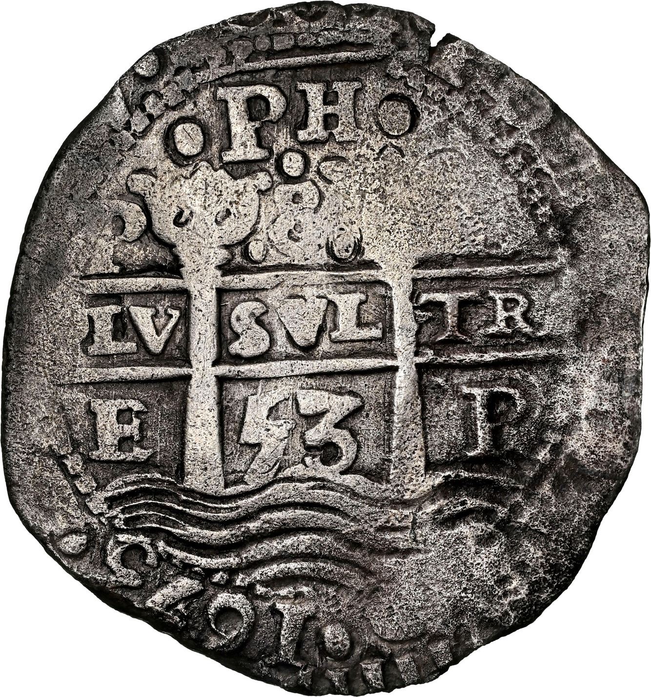BOLIVIA, Potosí, cob 8 reales, 1653 E, •PH• at top, •:pomegranate:• above cross, NGC XF details / saltwater damage (Shipwreck Blue Label), ex-Zbar. S-P37a; KM-21; Cal-1503. 24.02 grams. Great full pillars-and-waves with full four-digit date in legend (both of the others visible as well), full but off-center cross with complete PHILIPPVS as a result, light surface corrosion only with patchy dark toning, scarce variety (Mastalir III-bc.y2) with fancy three-dot ornaments flanking the pomegranate above the cross. Pedigreed to the Jack Zbar Collection (stated on label). Recovered from: Maravillas, sunk in 1656 off Grand Bahama Island