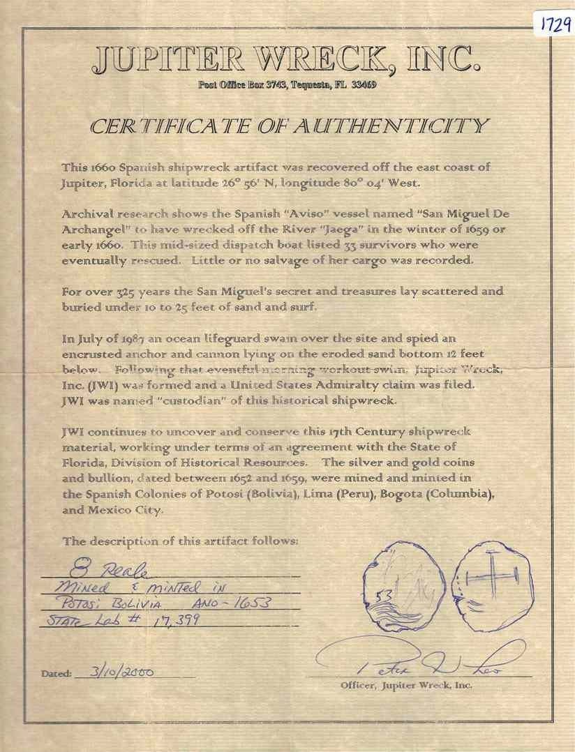 BOLIVIA, Potosí, cob 8 reales, 1653 E, ex-Leo. S-P37a; KM-21. 8.75 grams. Thin from heavy corrosion (exact variety not discernible) but with visible date between pillars, desirable certification to this popular wreck. With original Peter Leo certificate (state tag 17399). Recovered from: “Jupiter Wreck” (San Miguel Arcángel), sunk in 1659 off the east coast of Florida