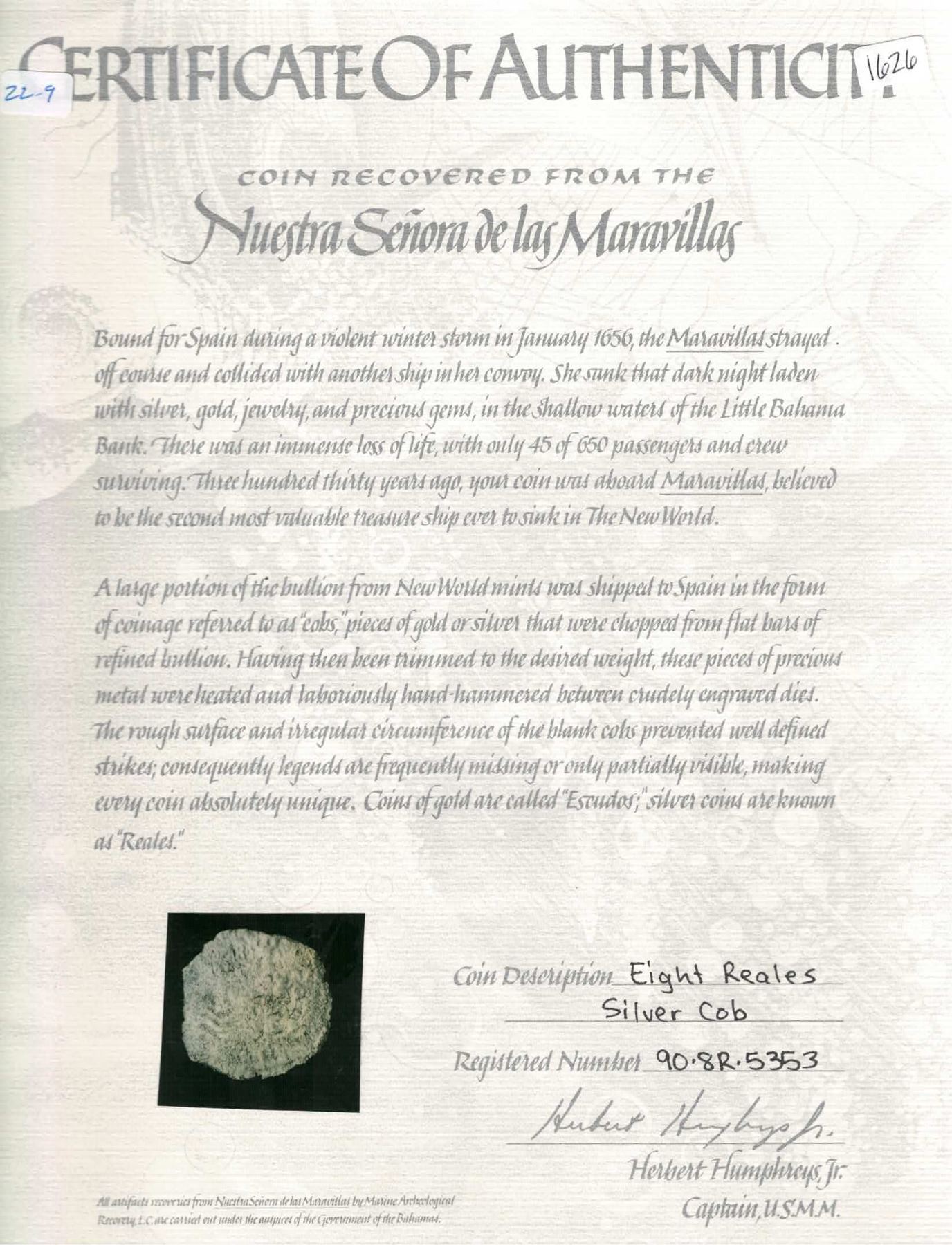 BOLIVIA, Potosí, cob 8 reales, 1653 E. S-P37a; KM-21; Cal-Type 334. 16.86 grams. Corroded and thin around the edges but with some pillars and cross detail, date just barely visible but certain, dull gray-toned surfaces. With original MAREX tag and certificate 91-8R-5353 (misattributed to Mexico, date and assayer not visible). Recovered from: Maravillas, sunk in 1656 off Grand Bahama Island