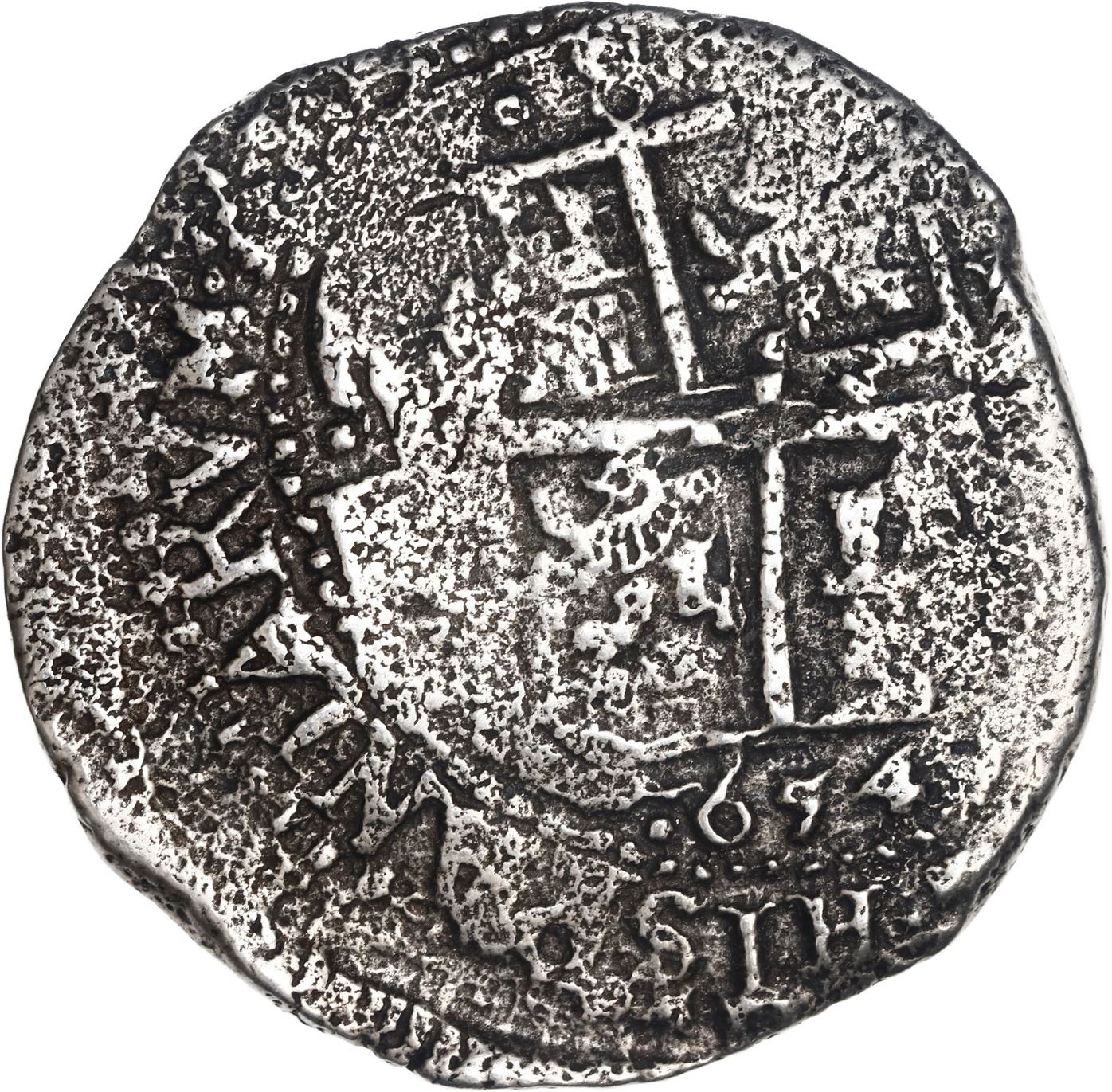 BOLIVIA, Potosí, cob 8 reales, 1654 E, •PH• at top, •8• above cross. S-P37a; KM-21; Cal-1507. 22.46 grams. Full pillars-and-waves with crown above, doubled full cross with weak spots and moderate corrosion all over, two bold dates, lightly toned. Recovered from: Capitana, sunk in 1654 off Chanduy, Ecuador