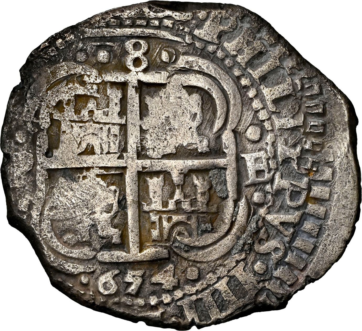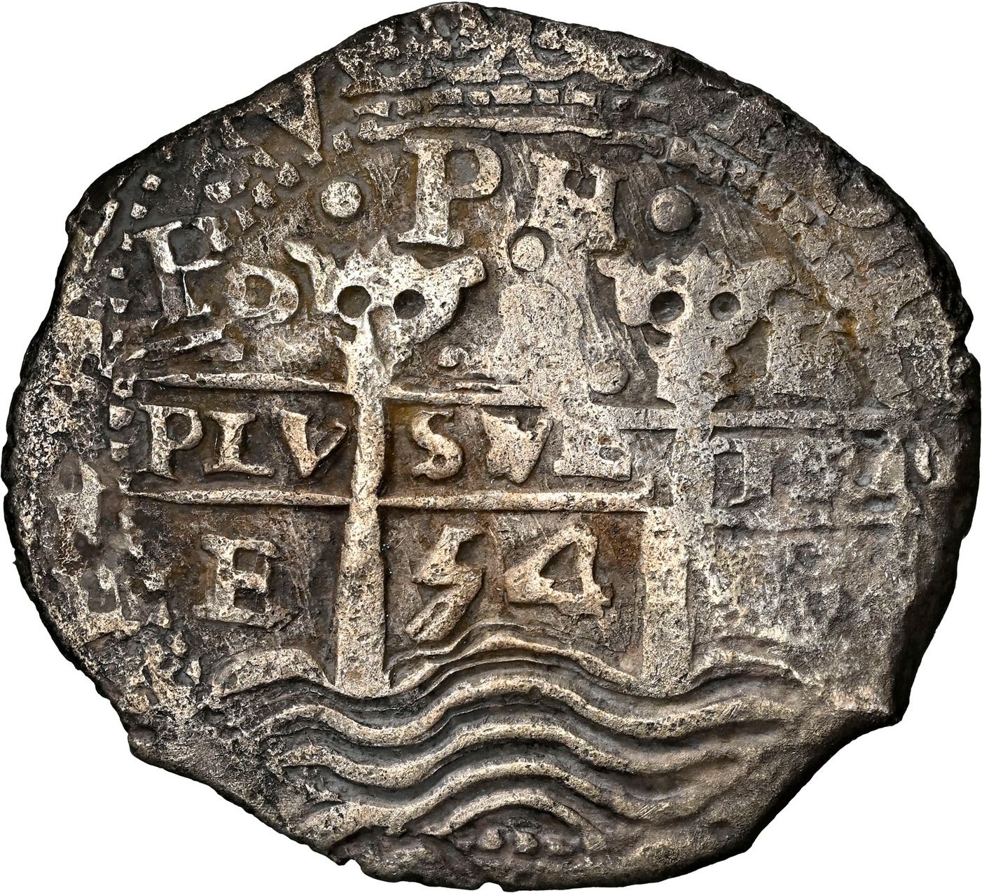 BOLIVIA, Potosí, cob 8 reales, 1654 E, •PH• at top, •8• above cross, NGC XF details / saltwater damage (Shipwreck Blue Label), ex-Zbar. S-P37a; KM-21; Cal-1507. 25.48 grams. Full but off-center cross with complete PHILIPPVS IIII, 100% full pillars-and-waves, two dates, light toning and minimal surface corrosion, variety II-bc.wy2 in Mastalir. Pedigreed to the Jack Zbar Collection (stated on label). Recovered from: Maravillas, sunk in 1656 off Grand Bahama Island