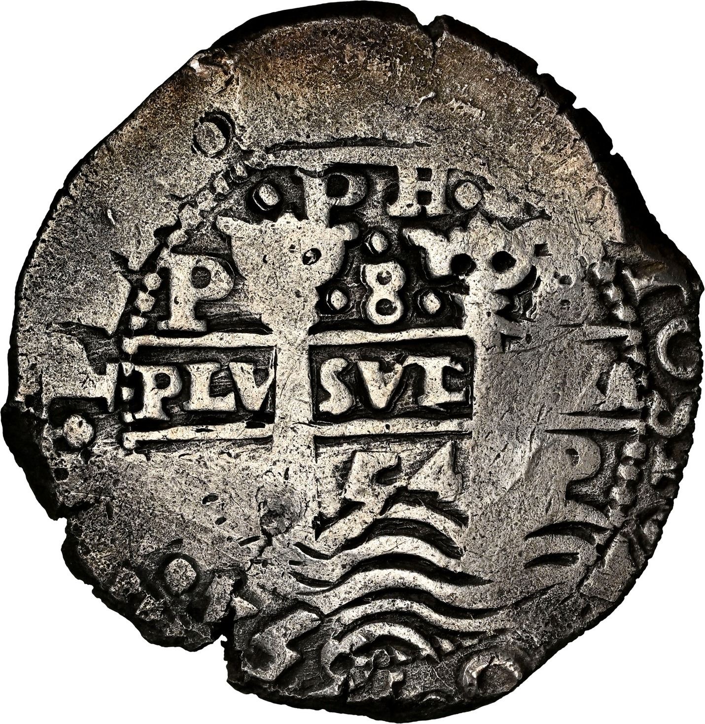 BOLIVIA, Potosí, cob 8 reales, 1654 E, •PH• at top, •pomegranate• above cross, NGC AU details / saltwater damage (Shipwreck Blue Label), ex-Zbar. S-P37a; KM-21; Cal-1506. 26.75 grams. Solid and virtually corrosion-free but with some weak strike in the full pillars-and-waves and cross-lions-castles, three dates, full king's name and ordinal, toned on fields, variety I-bc.xx in Mastalir. Pedigreed to the Jack Zbar Collection (stated on label). Recovered from: Maravillas, sunk in 1656 off Grand Bahama Island