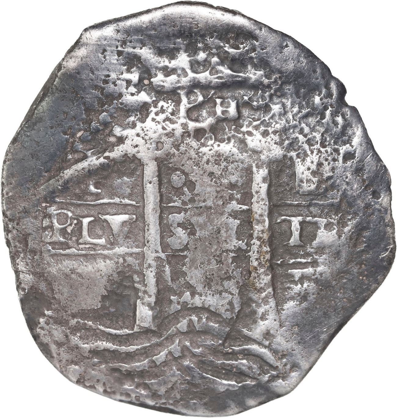 BOLIVIA, Potosí, cob 8 reales, 1656 E, PH at top. S-P37a; KM-21; Cal-Type 334. 22.78 grams. Full pillars-and-waves and cross-lions-castles with date below (the top part slightly doubled, hence uncertain whether it is an 8 or a pomegranate, which are different Calicó numbers), typically corroded and with patchy toning, rather scarce mint for this wreck. With original certificate from the salvor/conservator. Recovered from: Joanna, sunk in 1682 off South Africa