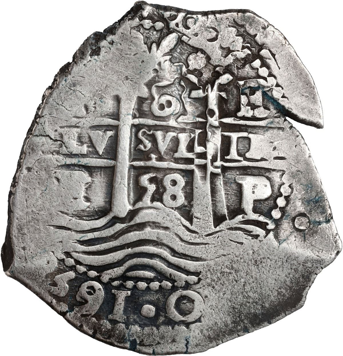 BOLIVIA, Potosí, cob 8 reales, 1658 E, denomination 8 above cross. S-P37a; KM-21; Cal-1522. 27.59 grams. Choice full cross-lions-castles and pillars-and-waves on a very odd-shaped flan with three dates including bold 1658 in legend and 658 twice below cross due to slight doubling, scarcer variety with denomination instead of pomegranate at top, all three mintmarks and assayers, attractively toned VF with a few light, old scratches in periphery.