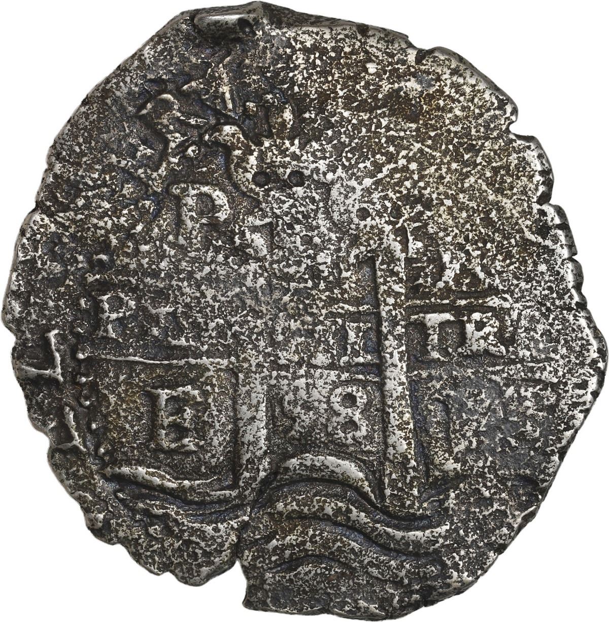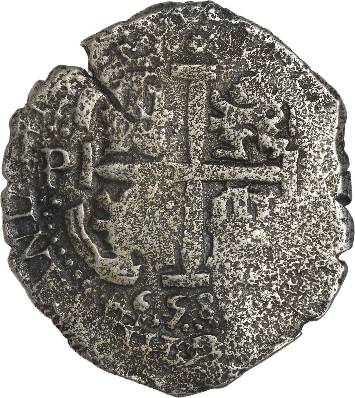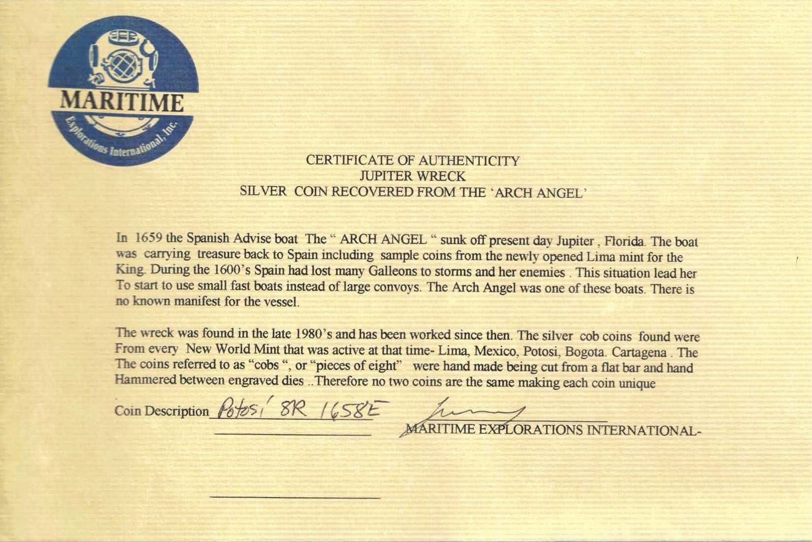 BOLIVIA, Potosí, cob 8 reales, 1658 E, •pomegranate• above cross, ex-Ullian. S-P37a; KM-21; Cal-1520. 23.59 grams. Bold waves, the pillars and cross full but weak due to surface corrosion, still with two clear dates and mintmarks and one bold assayer, lightly toned, small edge-crack. With original tag and certificate signed by Lou Ullian (Maritime Explorations International). Recovered from: “Jupiter Wreck” (San Miguel Arcángel), sunk in 1659 off the east coast of Florida
