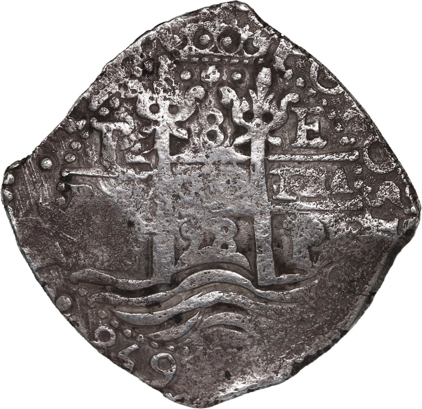 BOLIVIA, Potosí, cob 8 reales, 1658 E, pomegranate above cross. S-P37a; KM-21; Cal-1520. 25.54 grams. Curiously squarish flan with good full pillars-and-waves and cross-lions-castles despite flat areas, parts of all three dates and mintmarks and assayers, lightly toned and well centered, surface-corroded all over. With State of Florida plastic tag 15,733 and original photo-certificate from the salvor (Dominic Addario), also with note indicating connection to Peter Leo in 1988. Recovered from: “Jupiter Wreck” (San Miguel Arcángel), sunk in 1659 off the east coast of Florida