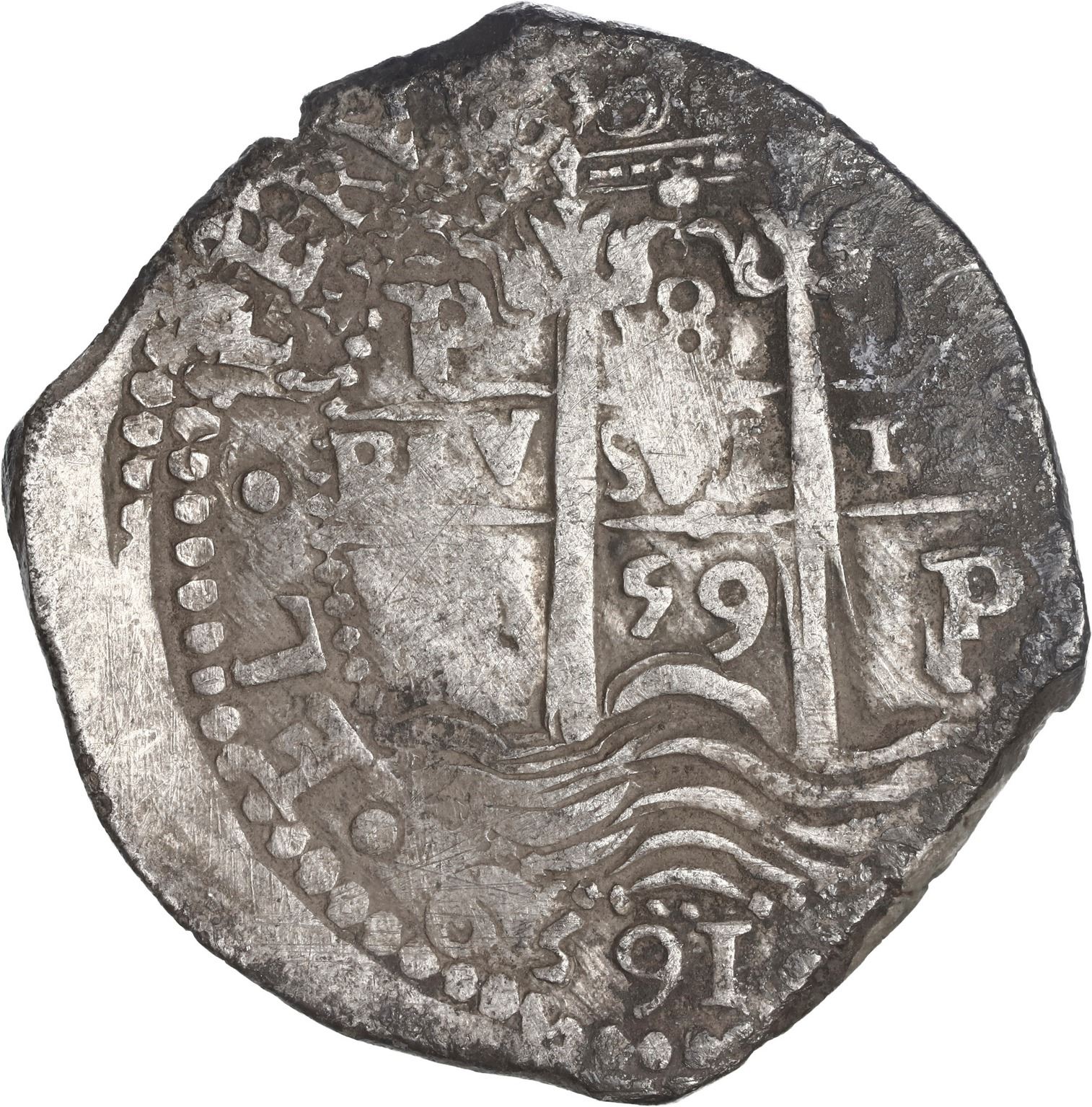 BOLIVIA, Potosí, cob 8 reales, 1659 E. S-P37a; KM-21; Cal-1523. 26.48 grams. Full pillars-and-waves, full but weaker cross, three full dates and mintmarks despite flat areas and distracting uneven toning, sediment, oxidation, and verdigris, overall AVF.