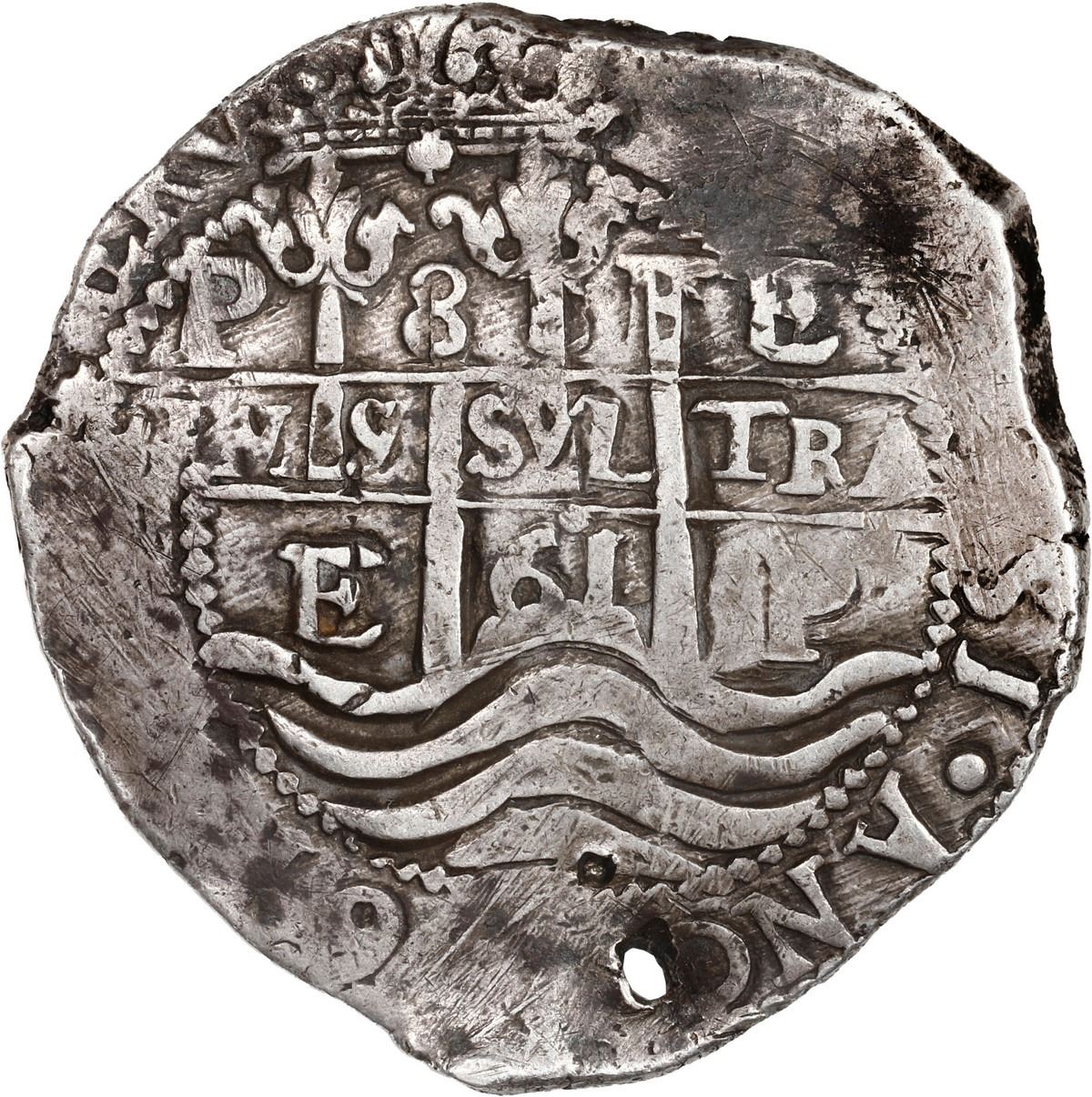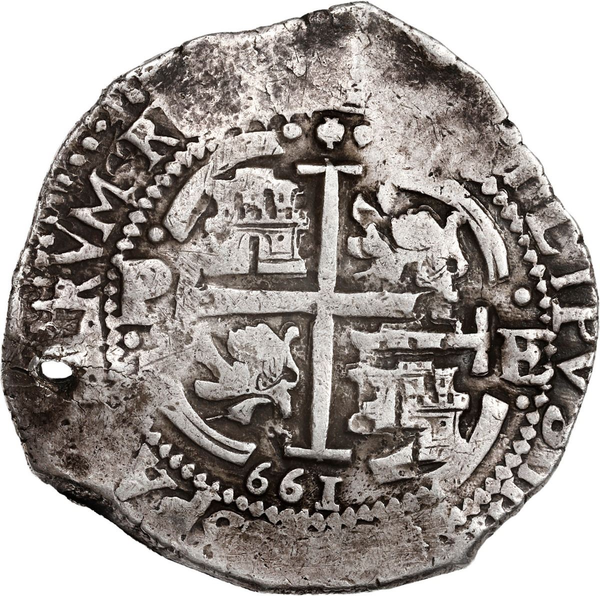 BOLIVIA, Potosí, cob 8 reales, 1661 E. S-P37a; KM-21; Cal-1525. 27.12 grams. Very broad flan with doubled but very well-detailed full cross-lions-castles and pillars with 100% complete waves, all three dates and mintmarks and assayers, toned VF+ with crude hole below waves / left of cross.