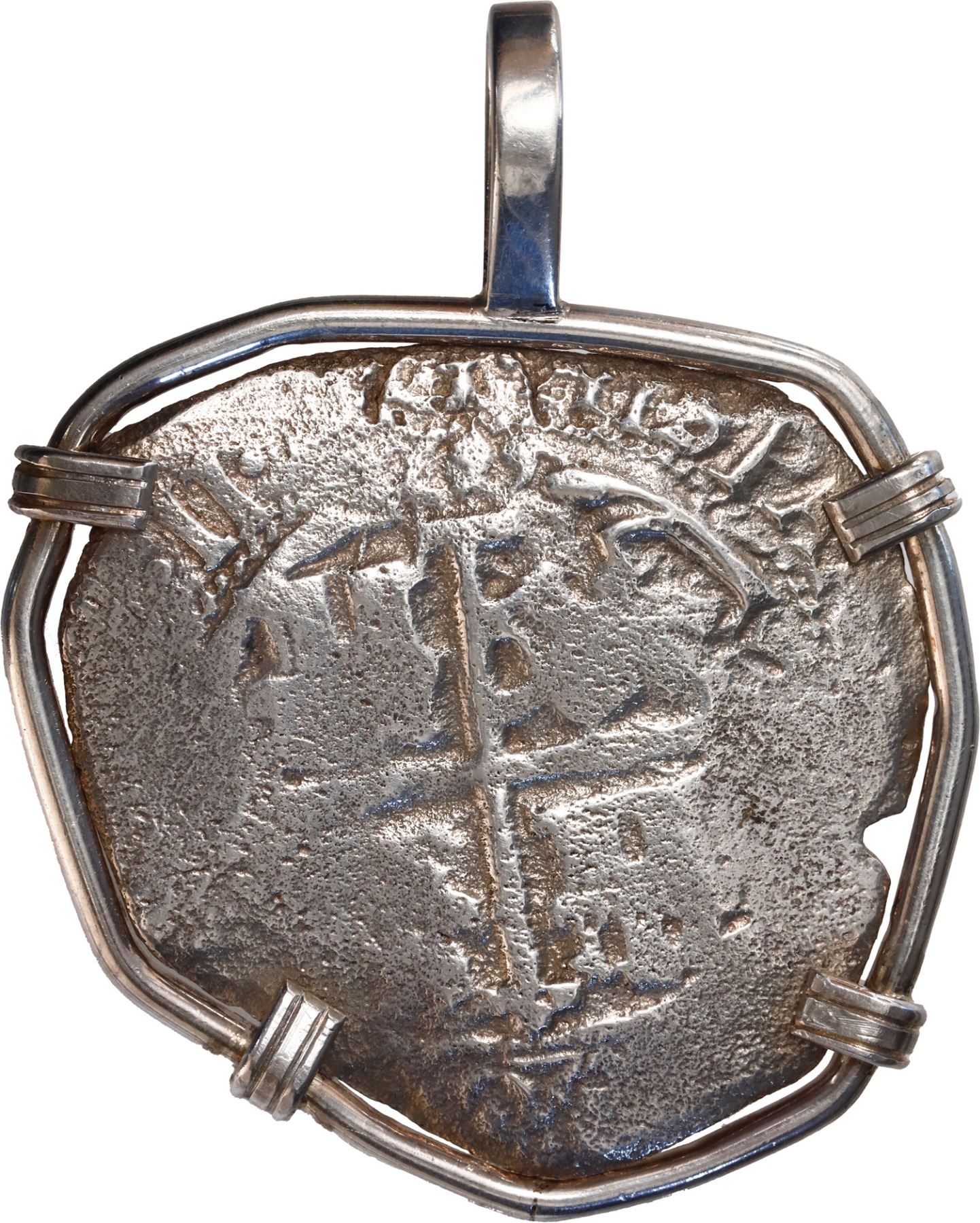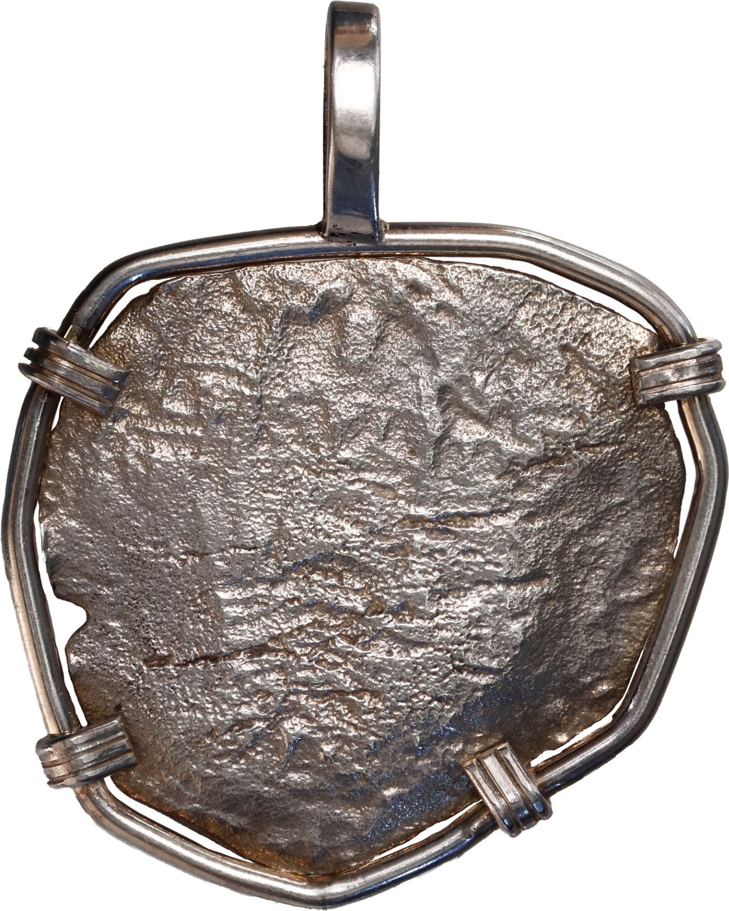 BOLIVIA, Potosí, cob 8 reales, 1667 E, ex-Consolación (1681), mounted pillars-side out in silver pendant with fixed bail. 25.42 grams total. Silvery, corroded piece with nearly full cross and partial legends including clear king's ordinal II, pillars side rather weak with date barely visible but certain. From the Consolación (1681).