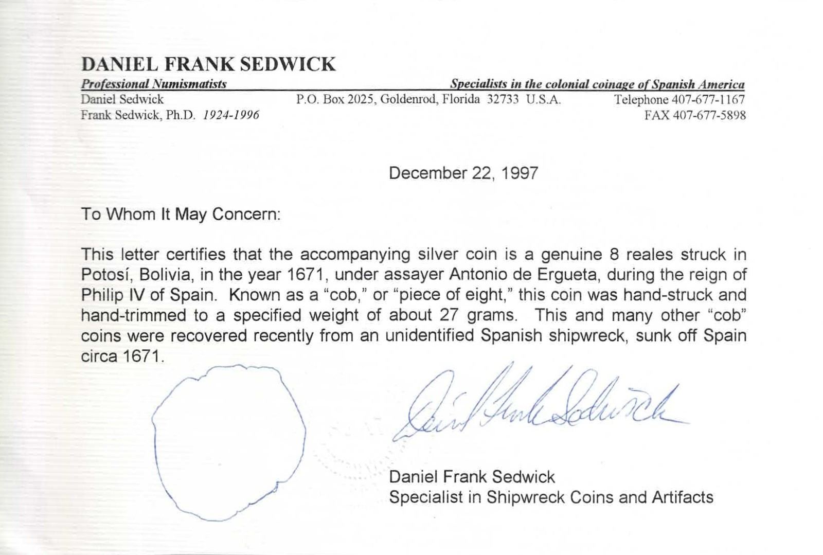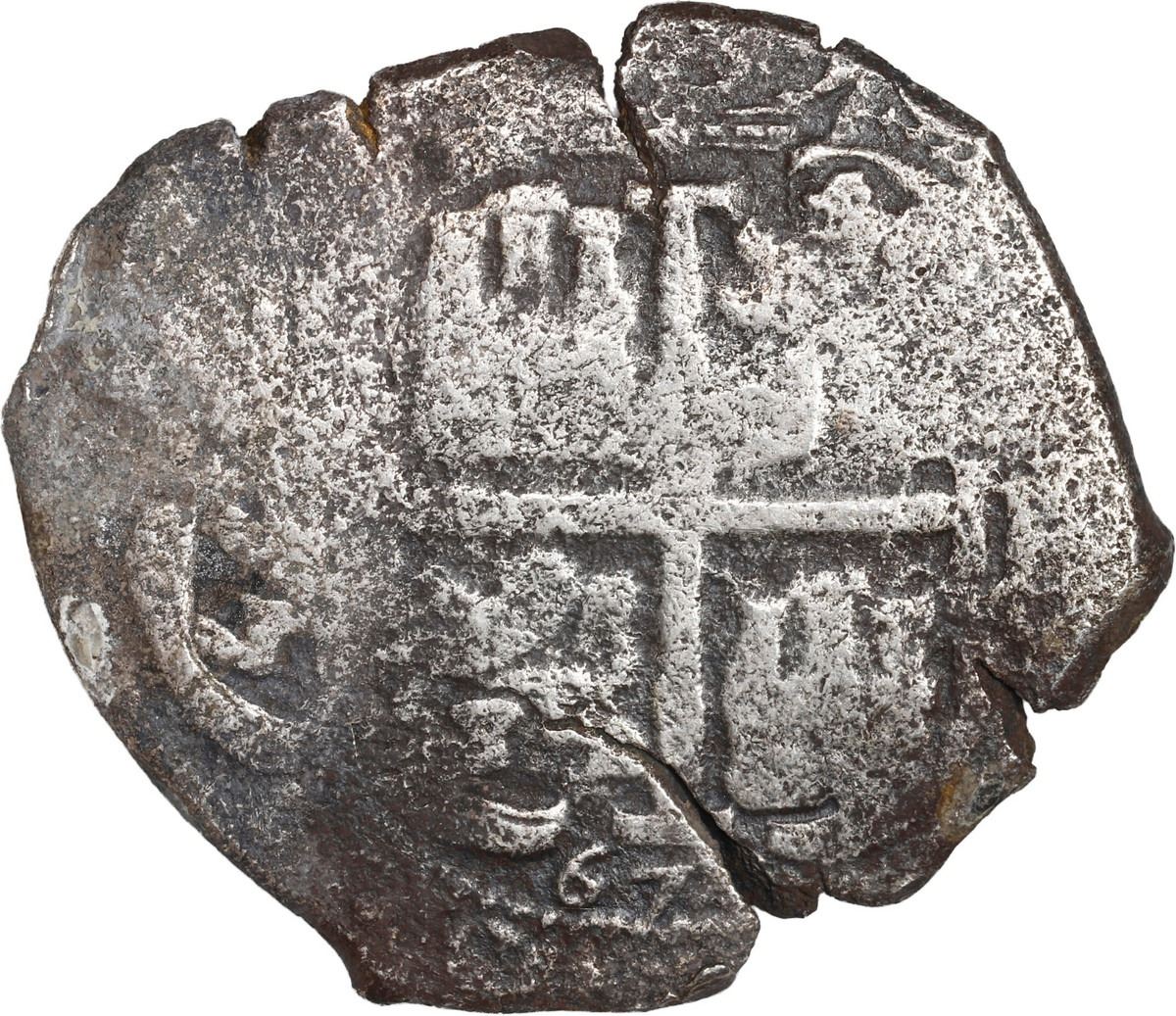 BOLIVIA, Potosí, cob 8 reales, 1671 E. S-P37b; KM-26; Cal-702. 25.28 grams. Salvaged VF, struck on a broad and crude planchet with bold pillars, full but weak cross with clear date below, some patches of encrustation. With Sedwick certificate.