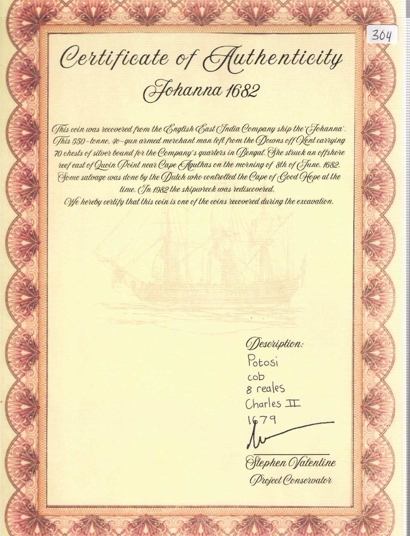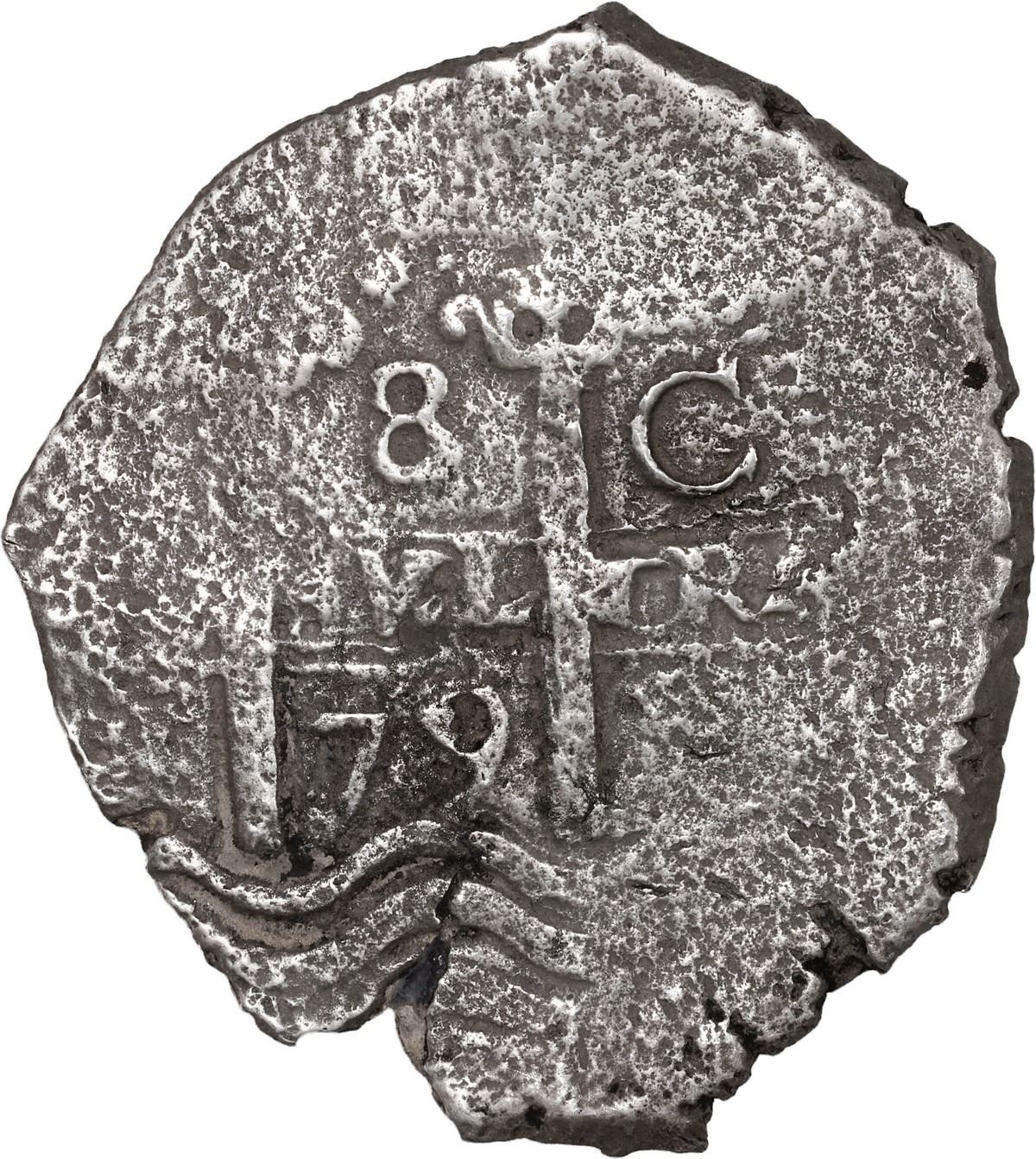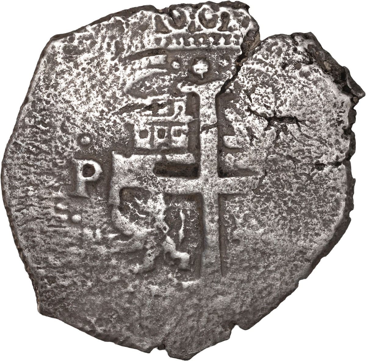 BOLIVIA, Potosí, cob 8 reales, 1679 C. S-P38; KM-26; Cal-714. 22.41 grams. Off-center pillars-and-waves with bold date and assayer, nearly full cross with bold mintmark P, scarce type for this wreck, with only moderate surface corrosion, very lightly toned. Pedigreed to the Steve Valentine Collection, with original certificate from the salvor/conservator. Recovered from: Joanna, sunk in 1682 off South Africa