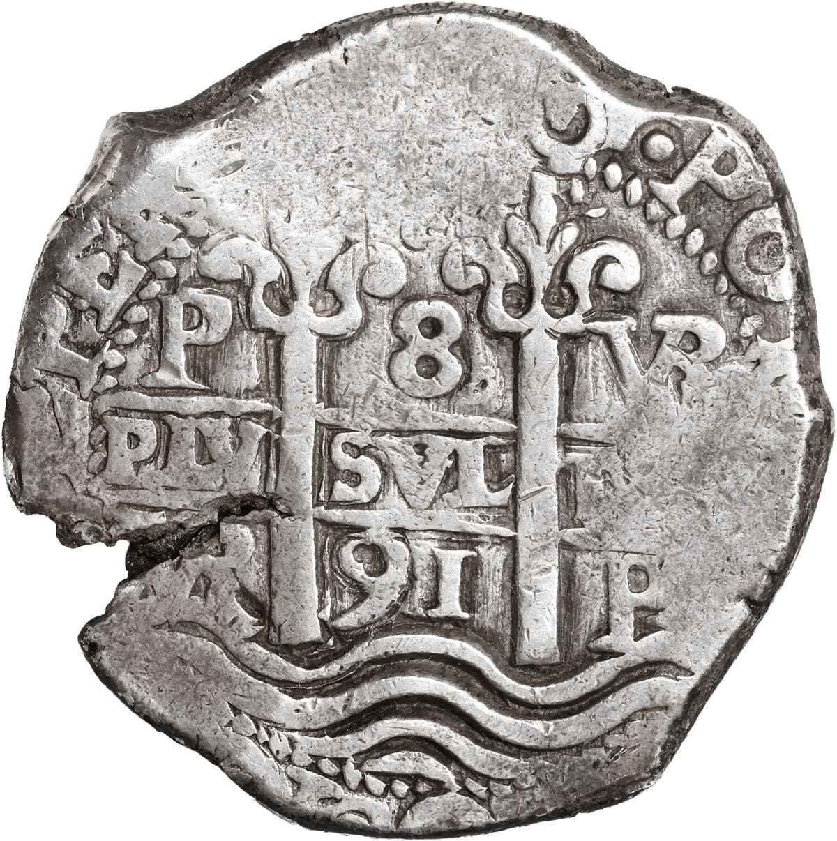 BOLIVIA, Potosí, cob 8 reales, 1691 VR. S-P40; KM-26; Cal-734. 27.54 grams. Boldly struck VF with nice full pillars and clear date between, nearly complete cross with partial legend and clear assayer, natural edge-crack, a few contact marks above cross.