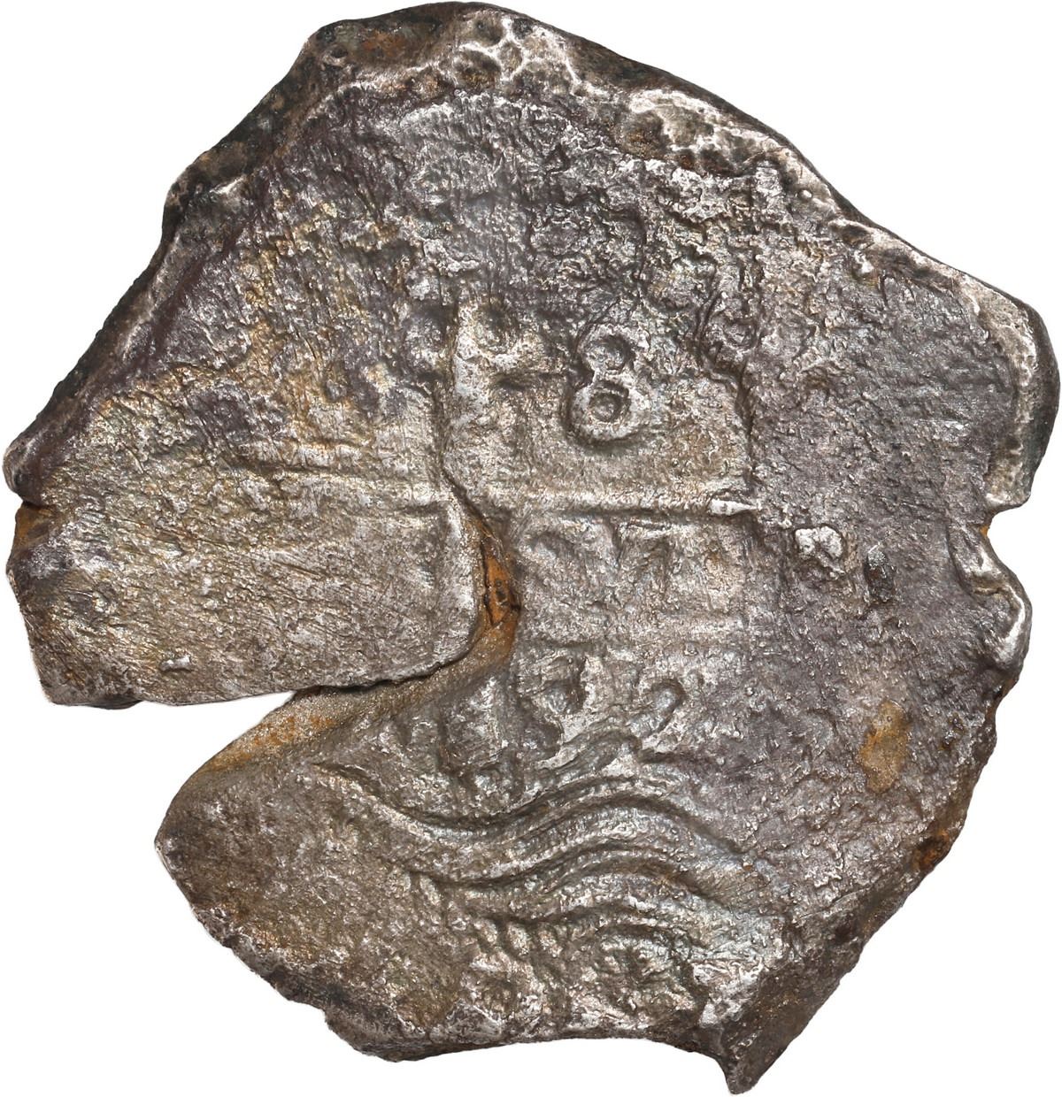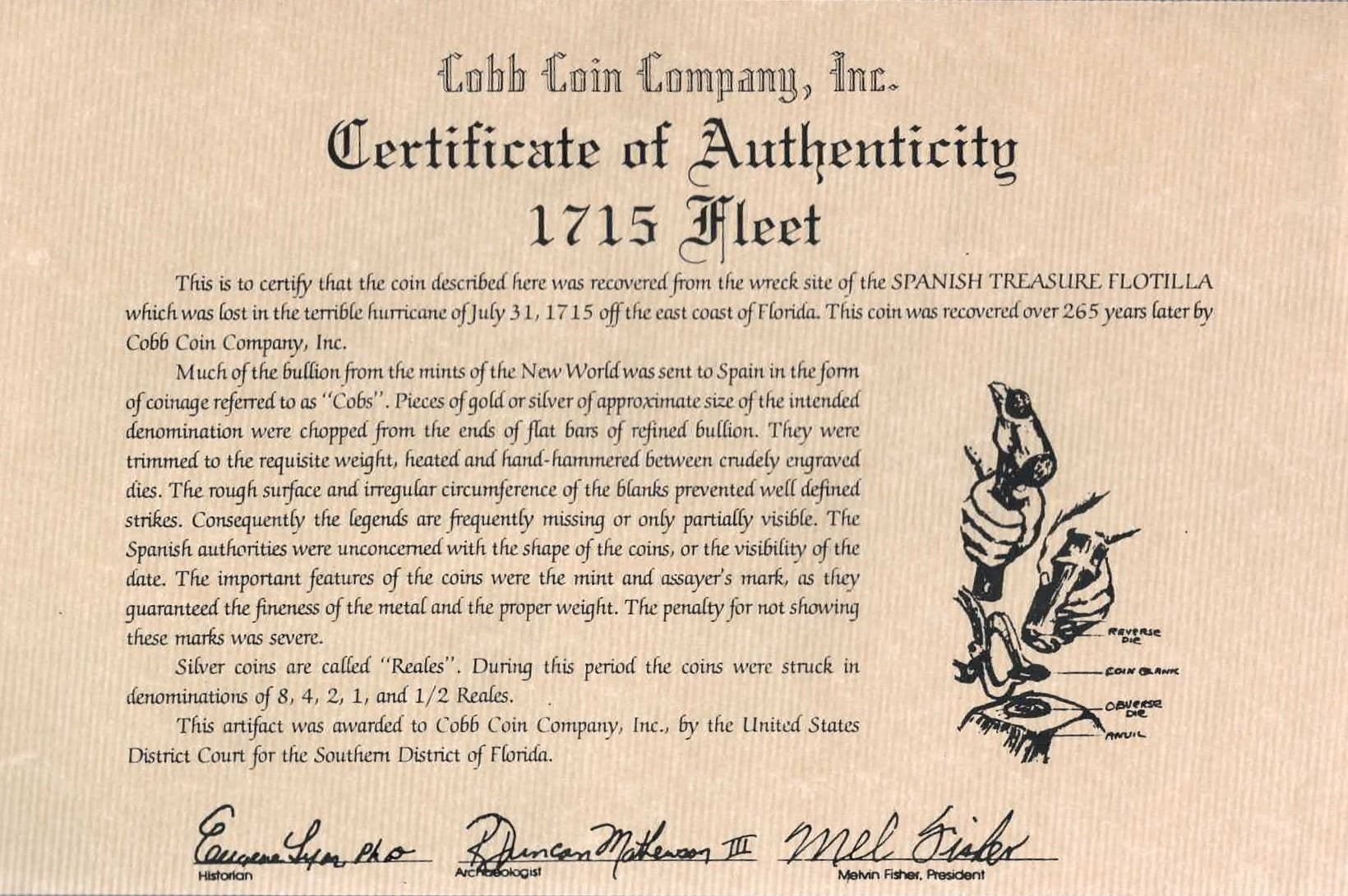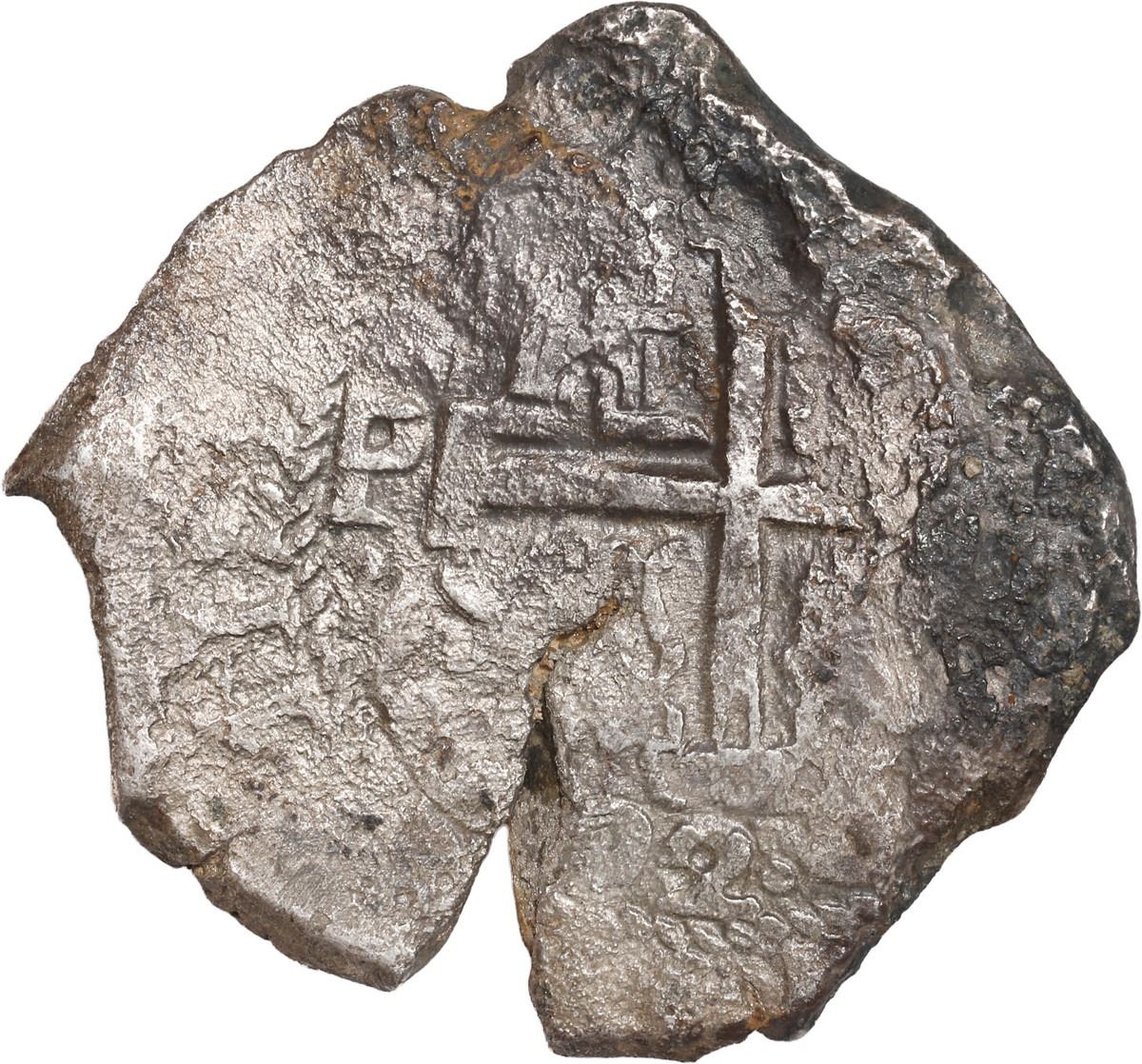 BOLIVIA, Potosí, cob 8 reales, 1692 (VR). S-P40; KM-26; Cal-735. 20.37 grams. Nearly full cross and pillars-and-waves with parts of all three dates visible, moderately to heavily corroded with large edge-crack, toned all over, scarce type from this wreck. With generic Cobb Coin Co. (Fisher) certificate. Recovered from: Spanish 1715 Fleet, sunk off the east coast of Florida