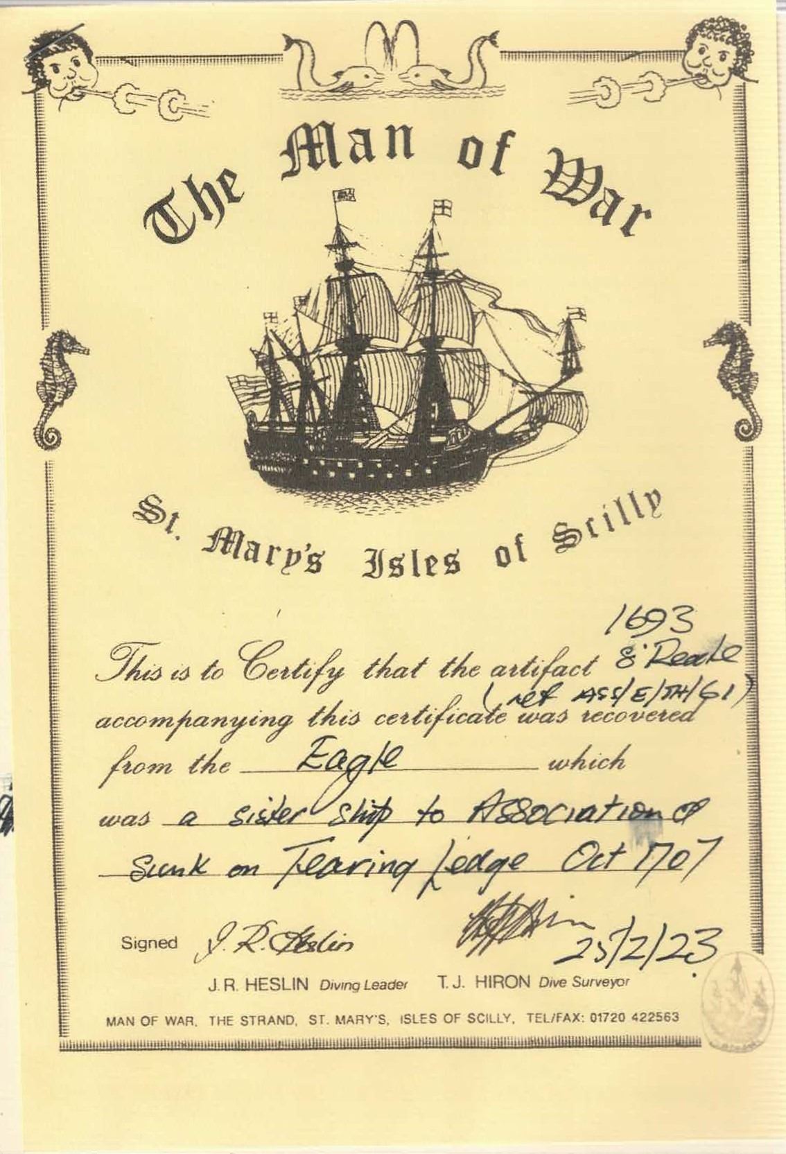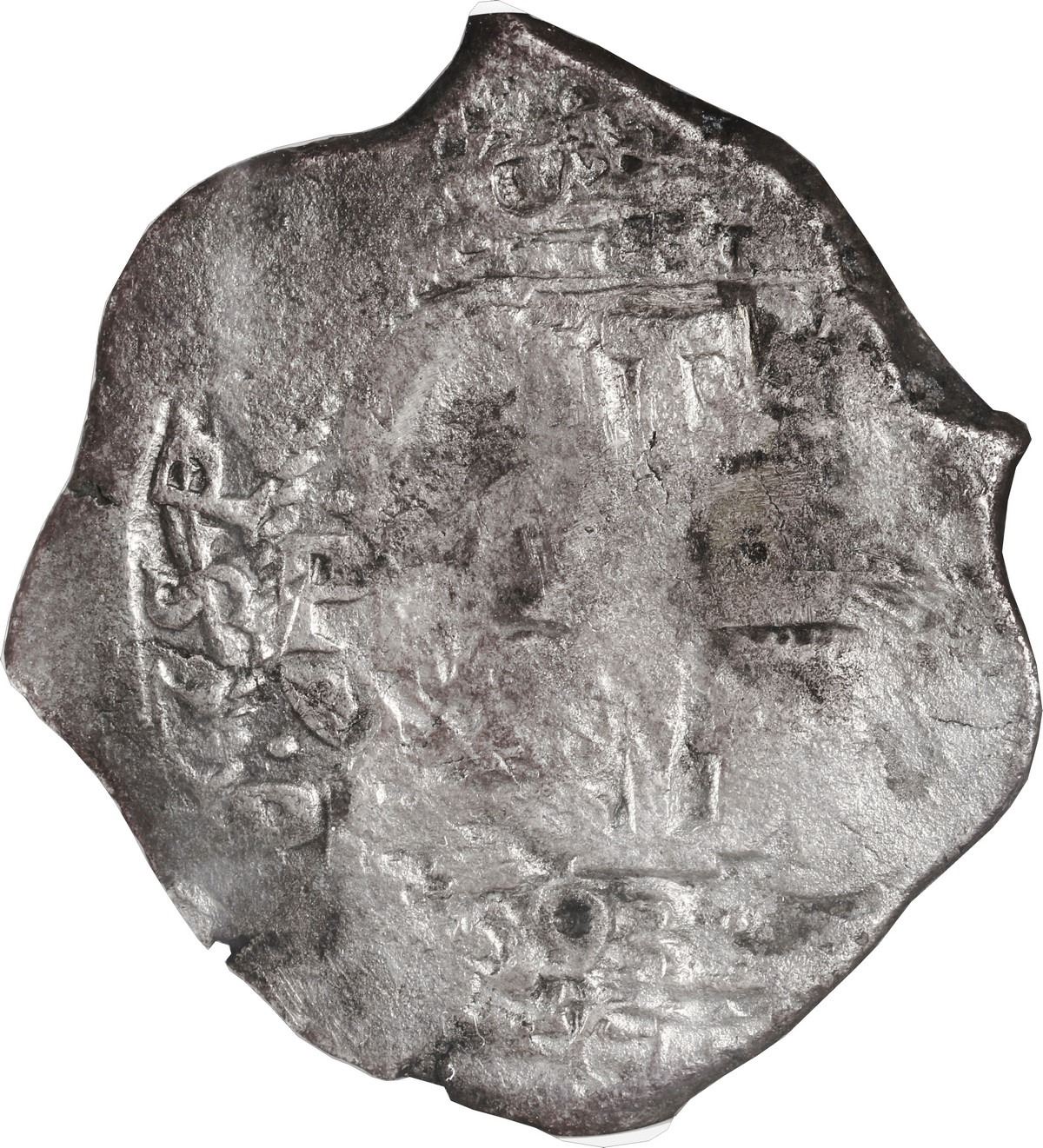 BOLIVIA, Potosí, cob 8 reales, 1693 VR, rare provenance, NGC VF details / saltwater damage (Shipwreck Blue Label). S-P40; KM-26; Cal-736. Full but mostly flat pillars-and-waves and cross with two clear dates and assayers, all three mintmarks, patchy toning (low contrast), one of very few coins certified from this sister-ship to the Association. With photo-certificate ASS/E/TH/61 from the salvor. Recovered from: Eagle, sunk in 1707 off the Isles of Scilly, southwest of England