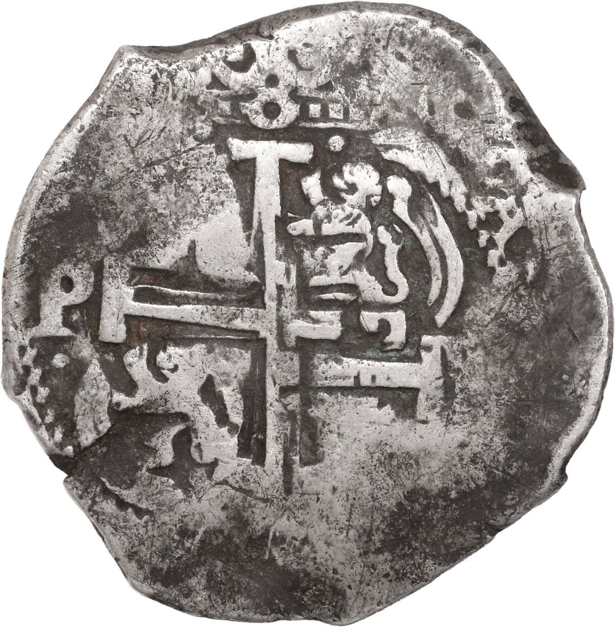 BOLIVIA, Potosí, cob 8 reales, 1694 VR. S-P40; KM-26; Cal-737. 26.77 grams. Double-struck Fine with patchy dark toning, off-center pillars with old scuffs, flat peripheries.