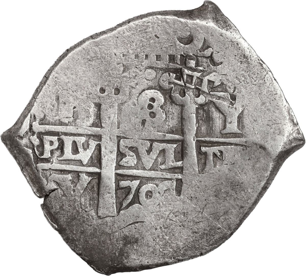 BOLIVIA, Potosí, cob 8 reales, 1704 Y. S-P43a; KM-31; Cal-1539. 26.19 grams. Nearly full pillars and cross on a chunky pillow-shaped flan with clear date and all three assayers, VF with light toning in crevices.