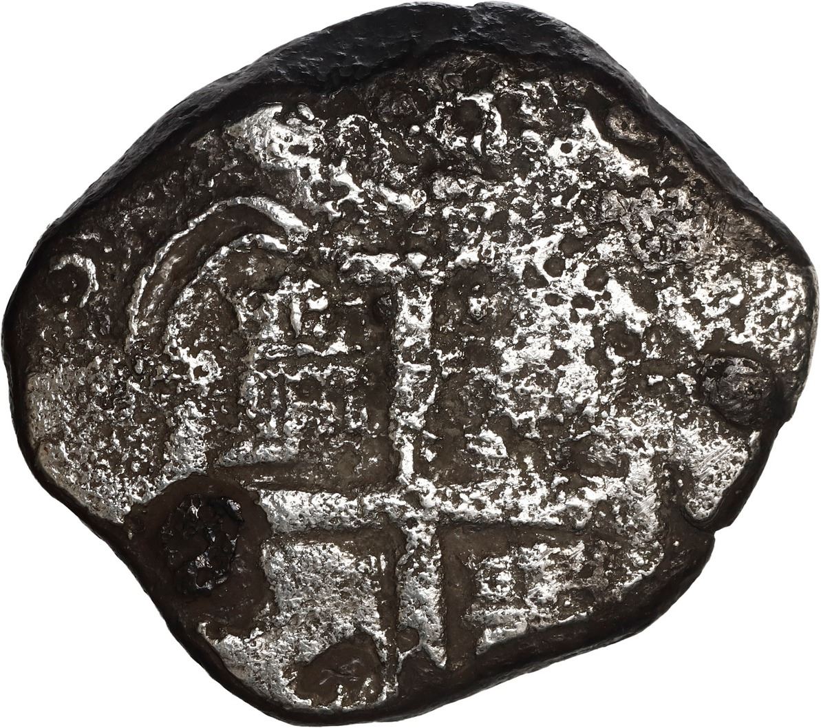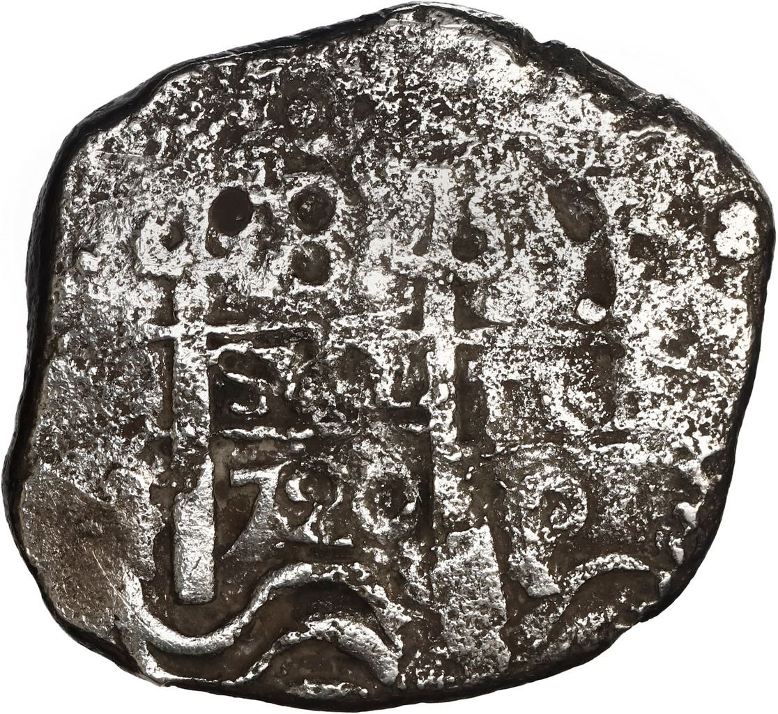 BOLIVIA, Potosí, cob 8 reales, 1720 Y. S-P43a; KM-31; Cal-1556. 16.86 grams. Corroded but with a clear date between pillars, off-center but nearly complete cross, a few dark encrustation spots. With photo-certificate. Recovered from: Princess Louisa, sunk in 1743 off the Cape Verde Islands, west of Africa