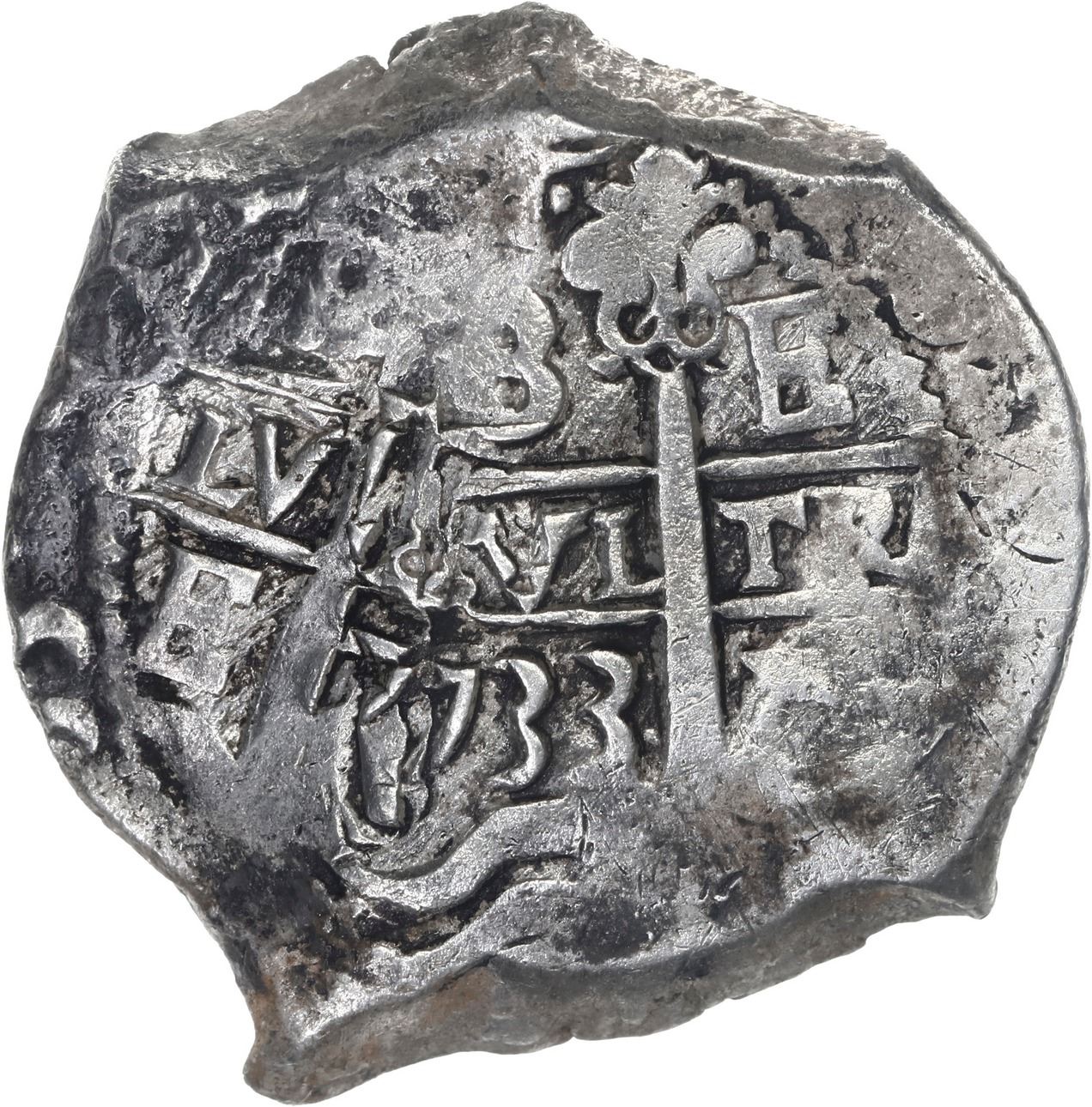 BOLIVIA, Potosí, cob 8 reales, 1733 E, rare, ex-Calbetó (Plate). S-P46; KM-31a; Cal-1568. 26.79 grams. Rather chunky flan with one sharp point, doubled pillars side with one choice full pillar, two clear dates and assayers, full but weaker cross with third date below and third assayer to right (rarer than YA for this date), XF with traces of surface oxidation and encrustation, toned in crevices. Plate Coin 1179 in Calbetó's Compendio de las piezas de ocho reales (1970).