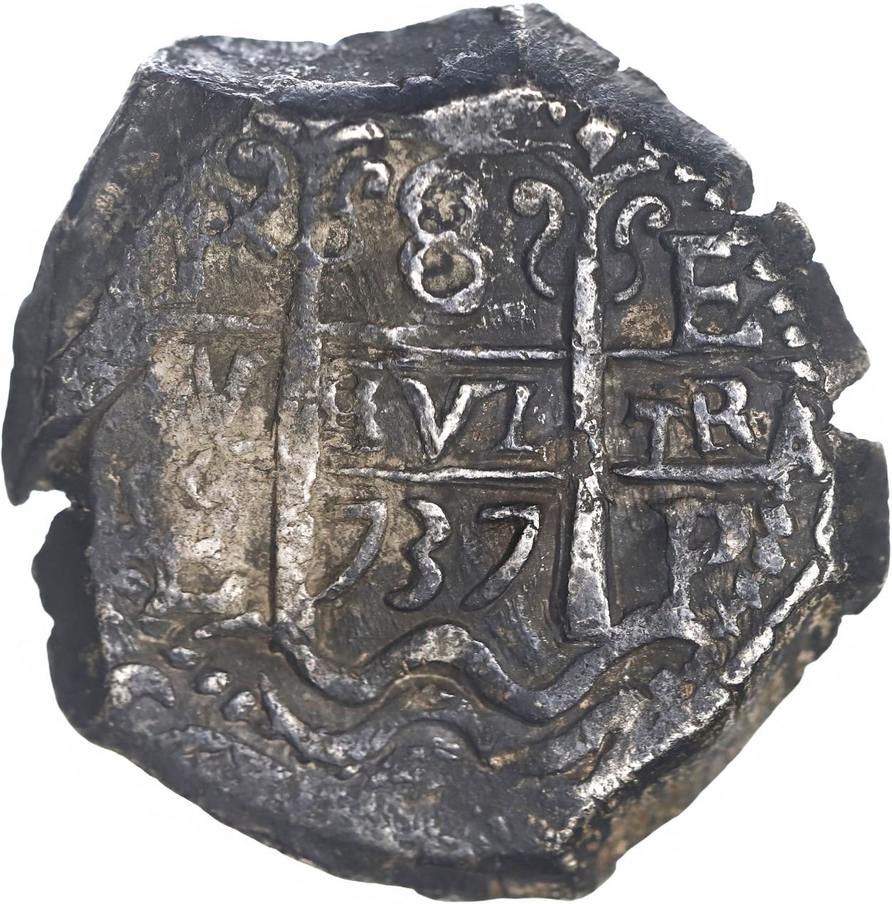 BOLIVIA, Potosí, cob 8 reales, 1737 E. S-P46; KM-31a; Cal-1573. 27.51 grams. Typically chunky flan with good full pillars-and-waves, off-center full cross-lions-castles with full PHILIPP(VS) outside of bold third assayer, all three dates visible, black-toned XF with traces of surface oxidation.