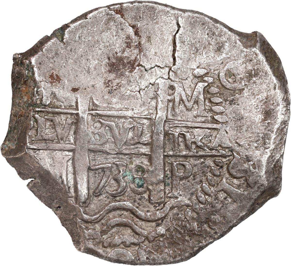 BOLIVIA, Potosí, cob 8 reales, 1738 M. S-P47; KM-31a; Cal-1576. 27.72 grams. XF with nice bold date between pillars, second full date visible below cross, dark gray-toned surfaces with a few encrustation spots.