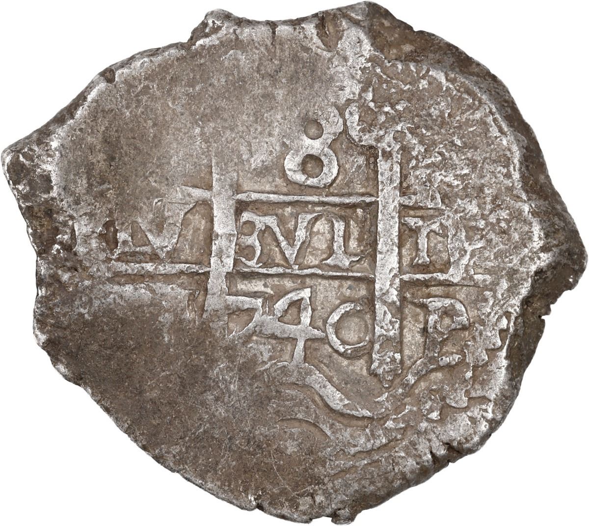BOLIVIA, Potosí, cob 8 reales, 1740 M. S-P47; KM-31a; Cal-1578. 26.95 grams. Crudely struck XF on a chunky flan but with a bold date between pillars, partial cross with clear denomination 8 above, brown sedimentation in the fields.
