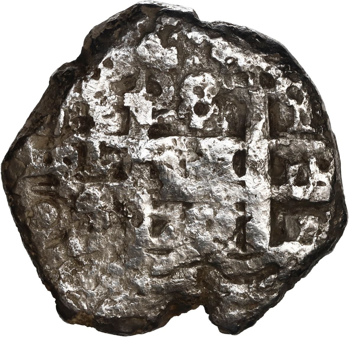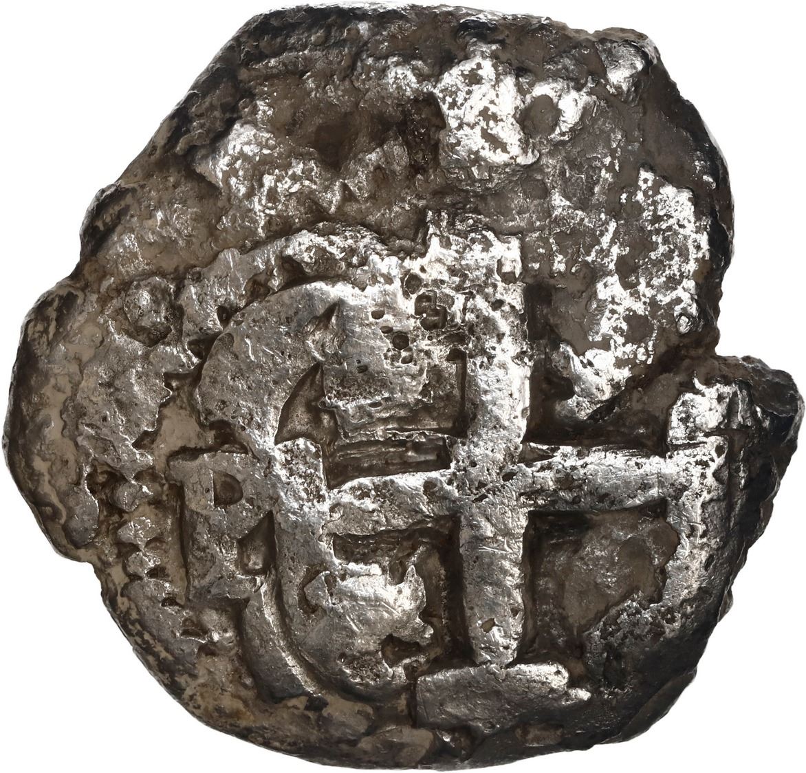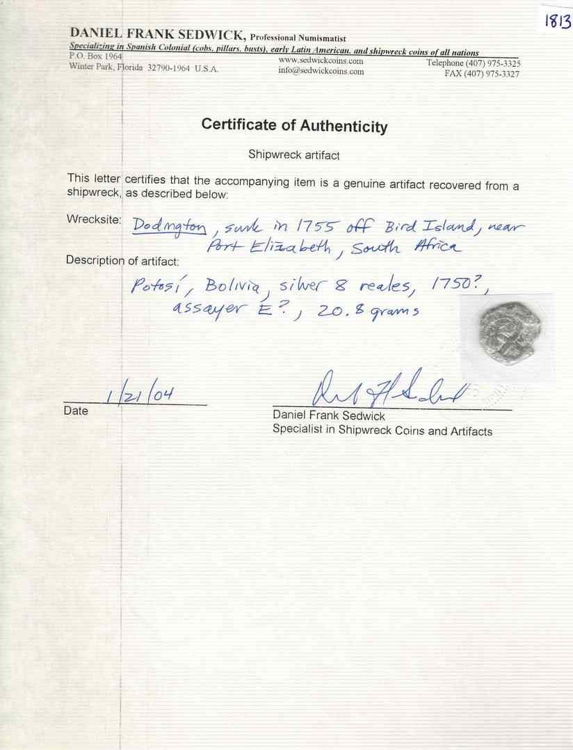 BOLIVIA, Potosí, cob 8 reales, 1750 E. S-P51; KM-40; Cal-515. 20.94 grams. Rough, somewhat corroded surfaces yet with a nice bold cross, pillars and date between a bit weak. With Sedwick photo-certificate from 2004. Recovered from: Dodington, sunk in 1755 off South Africa