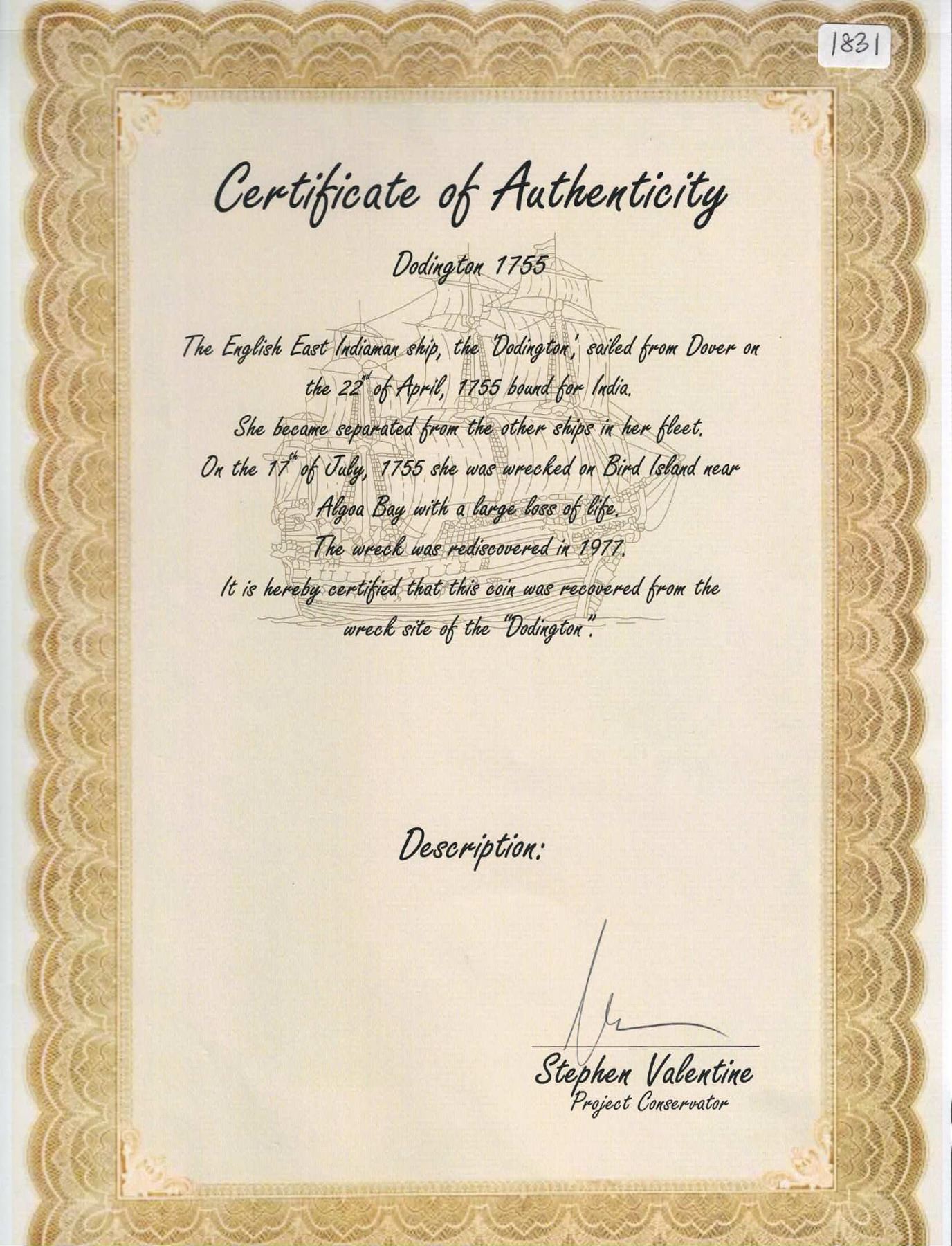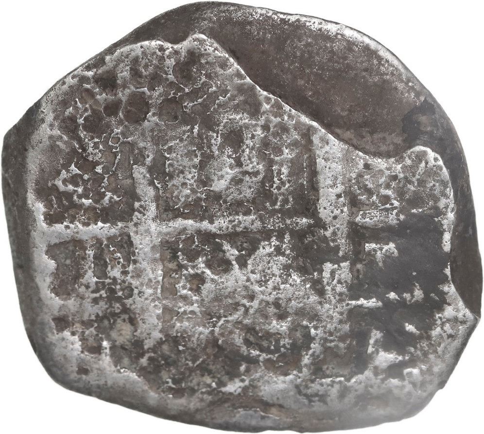 BOLIVIA, Potosí, cob 8 reales, 1752 q. S-P52; KM-40; Cal-522. 16.73 grams. Heavily corroded and thin along part of the edge, weak pillars with just enough of the date visible, clear assayer to right of cross. With original certificate from the salvor/conservator. Recovered from: Dodington, sunk in 1755 off South Africa