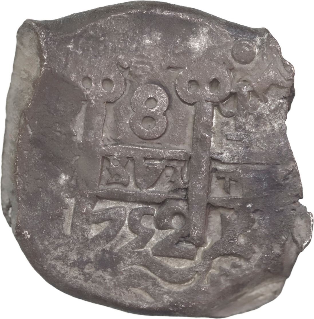 BOLIVIA, Potosí, cob 8 reales, 1752 q. S-P52; KM-40; Cal-522. 27.03 grams. Slate gray-toned AU with two clear date plus full pillars and cross, edges a bit crude as is typical.