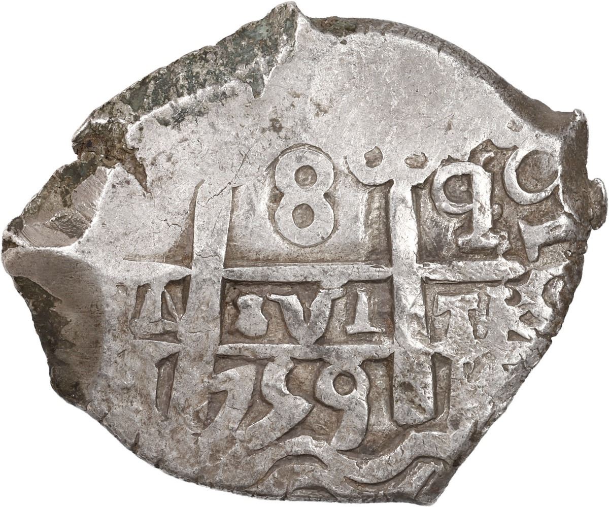 BOLIVIA, Potosí, cob 8 reales, 1759 q. S-P54; KM-40; Cal-537. 26.01 grams. Chunky XF with two full dates plus a clear assayer, partial cross, some light sedimentation.