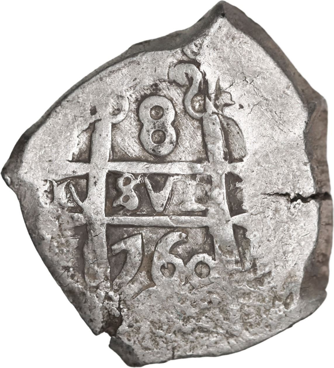 BOLIVIA, Potosí, cob 8 reales, 1760 Y-q-(V), very rare, ex-Mastalir. S-unl; KM-unl (40 for Type); Cal-unl (Type 65). 25.85 grams. Chunky flan showing full pillars with full and clear date, partial Y at upper right and q at bottom left (the V to right of cross not visible but known from another example), very rare "triple assayer" final issue of Ferdinand VI followed by V-Y under Charles III in the same year (see 1985 monograph by Carlos Janson in Cuadernos de Numismática y Ciencias Históricas), off-center cross, XF+ with light sediment on fields, flat peripheries with typical surface roughness (as made). Pedigreed to the Roberto Mastalir Collection, with his tag.