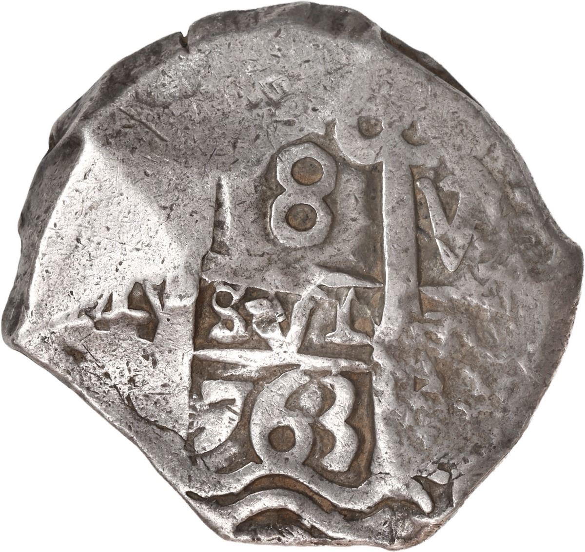 BOLIVIA, Potosí, cob 8 reales, 1763 V-(Y). S-P57; KM-45; Cal-1139. 26.86 grams. Very chunky round flan with good full cross, full pillars (the right-hand pillar 100%), two dates and two assayers (both V), lightly toned VF with typical as-made roughness near edges.