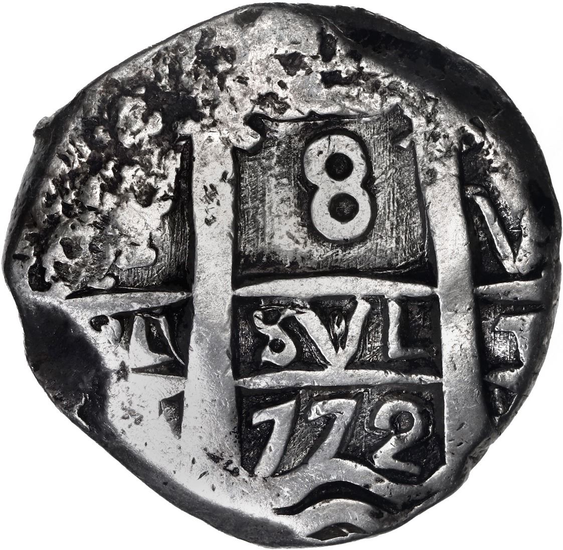 BOLIVIA, Potosí, cob 8 reales, 1772 (V-Y), ex-Calbetó (Plate). S-P59; KM-45; Cal-1156. 26.78 grams. Round and almost Royal-like flan with choice full cross-lions-castles (oversized) and full pillars with bold date and assayer V, VF+ with toning in crevices. Plate Coin 1242 in Calbetó's Compendio de las piezas de ocho reales (1970).