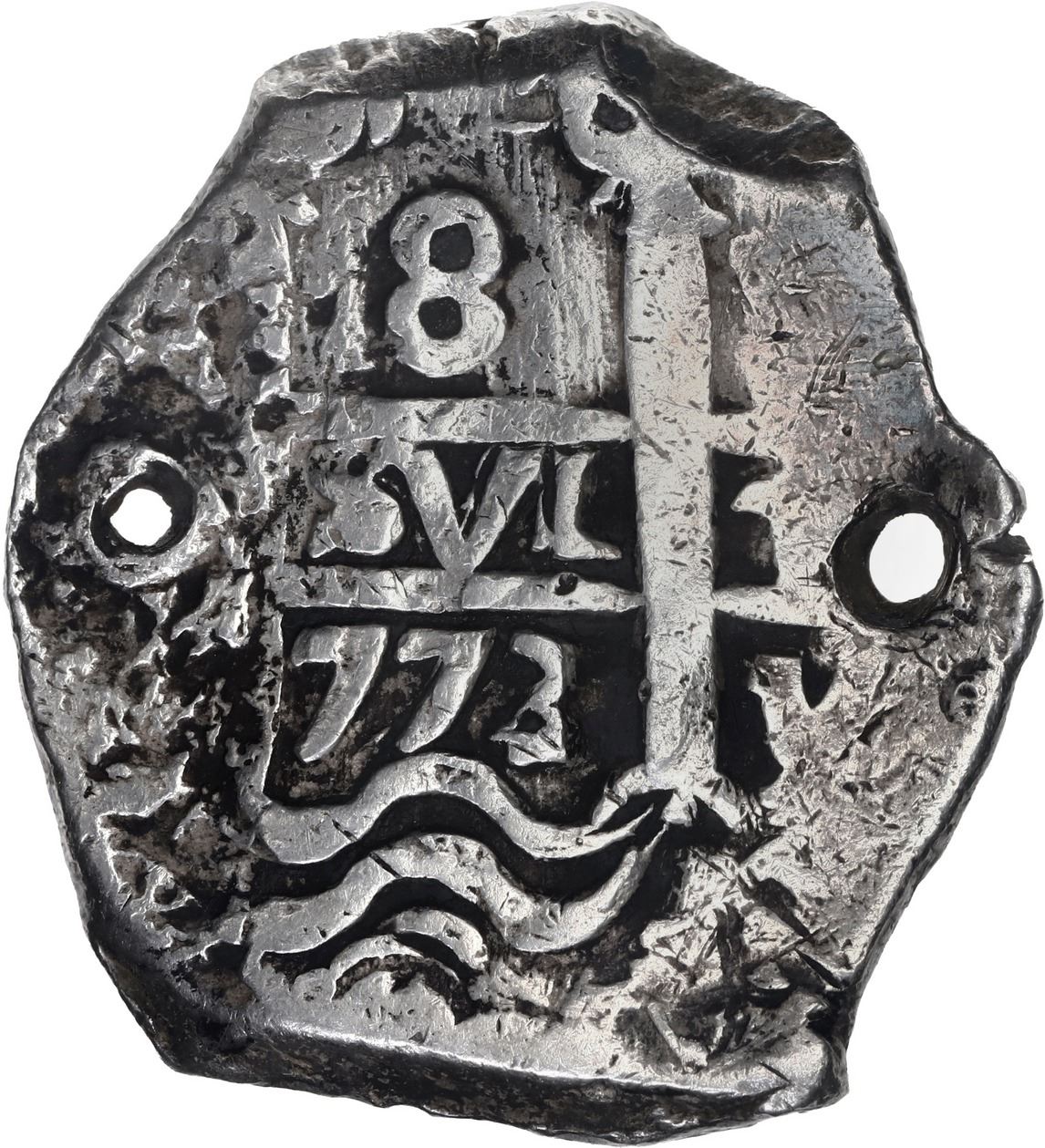 BOLIVIA, Potosí, cob 8 reales, 1773/2 V-Y, V at lower right on pillars side, rare, ex-Calbetó (Plate). S-P59; KM-unl (45 for type); Cal-unl (Type 109). 26.86 grams. Chunky flan with very bold date above full waves (clear 3/2, missed by Calbetó) with assayer V to right, nearly full cross with bold second assayer V to right, VF with toned fields, holed twice (to either side of pillars). Plate Coin 1247 in Calbetó's Compendio de las piezas de ocho reales (1970).
