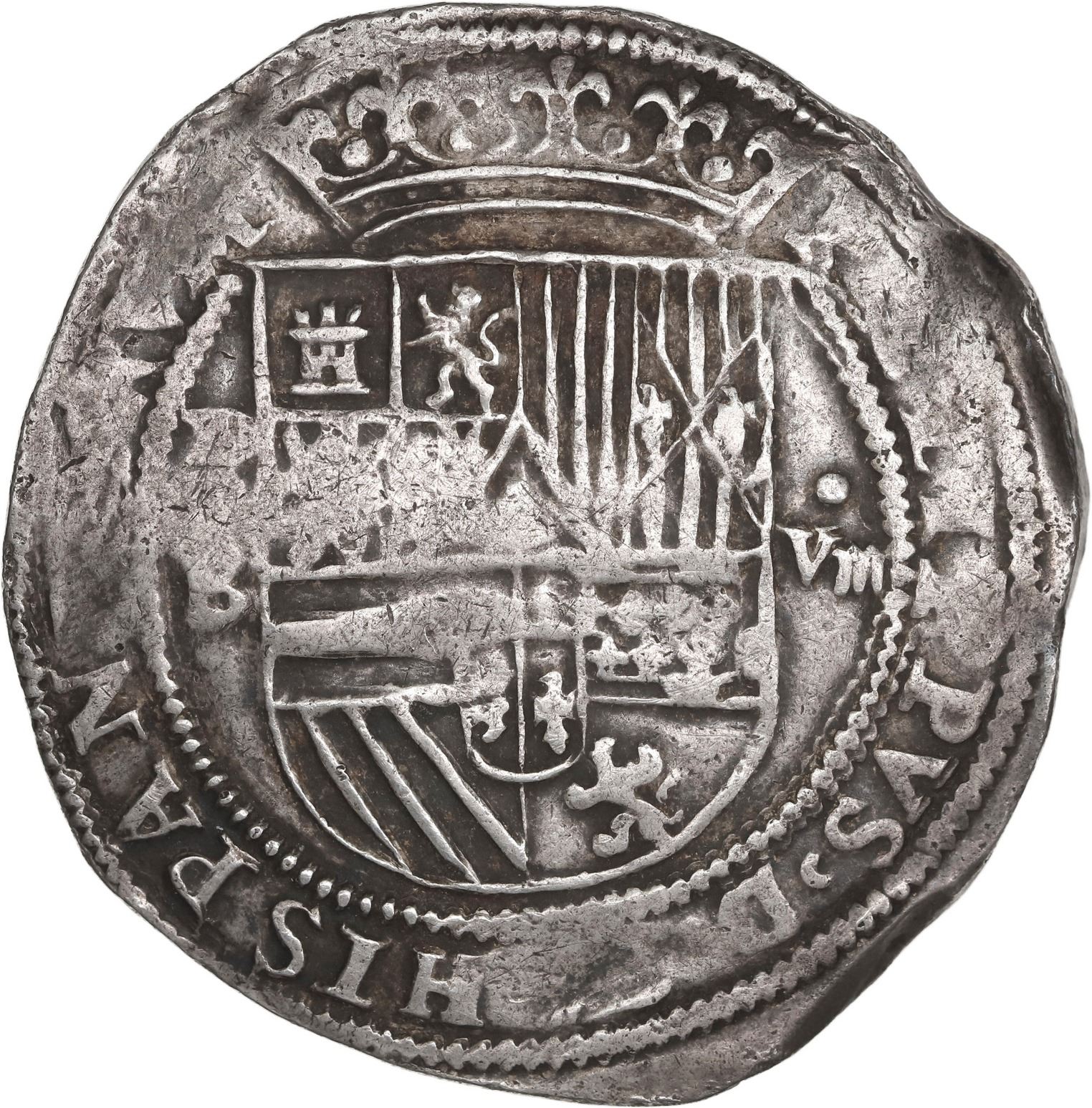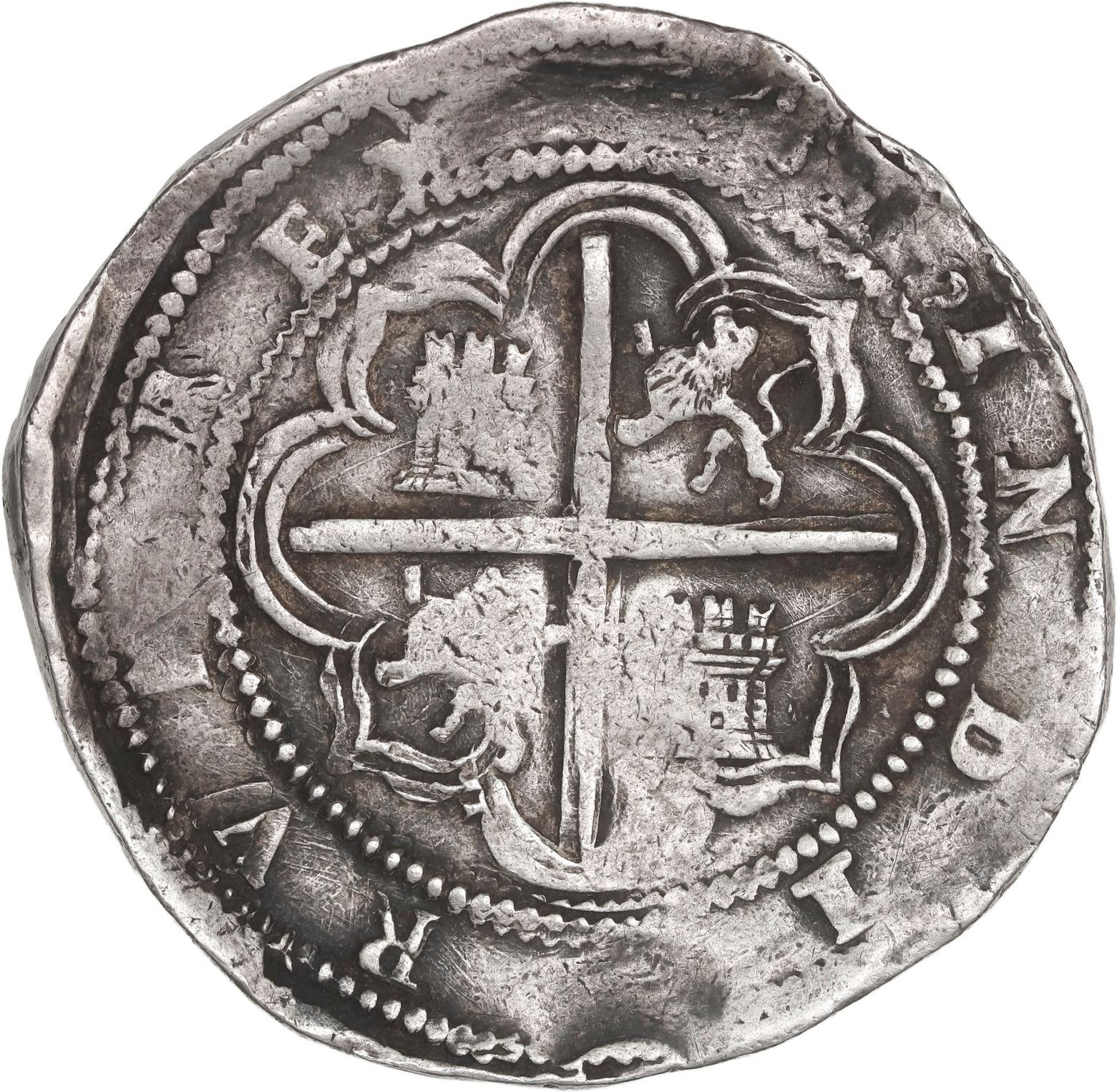 BOLIVIA, Potosí, cob 8 reales, Philip II, assayer B (1st period), "heavy" lions in cross, rare, ex-Ponte. S-P4; KM-5.1; Cal-672. 27.26 grams. Exceptionally broad flan (what Sellschopp referred to as "Great Module," which we now understand refers to certain coins in various periods) with excellent full crown and lots of bold legend, nice full shield and cross, AXF with deeply contrasting toning, one of several examples known struck from a single set of dies with a unique lion punch that was never seen again (Sellschopp 155, oddly overlooked by Paoletti). Pedigreed to the Luis R. Ponte Collection.