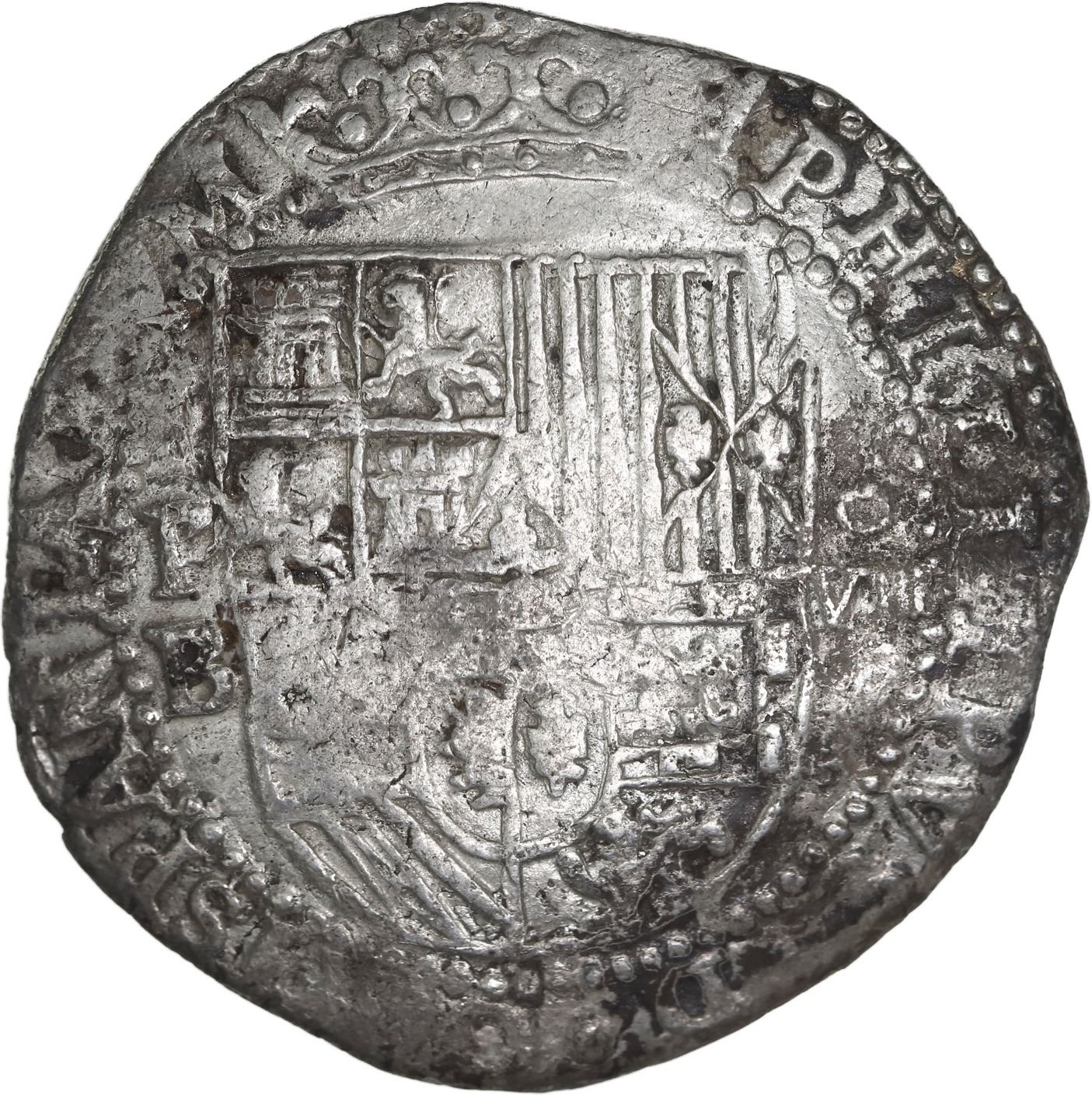 BOLIVIA, Potosí, cob 8 reales, Philip II, assayer B (4th period). S-P12; KM-5.1; Cal-672. 26.20 grams. XF with nice shield and cross, full king's name in legend, clear mintmark and assayer, a few spots of dark surface porosity.
