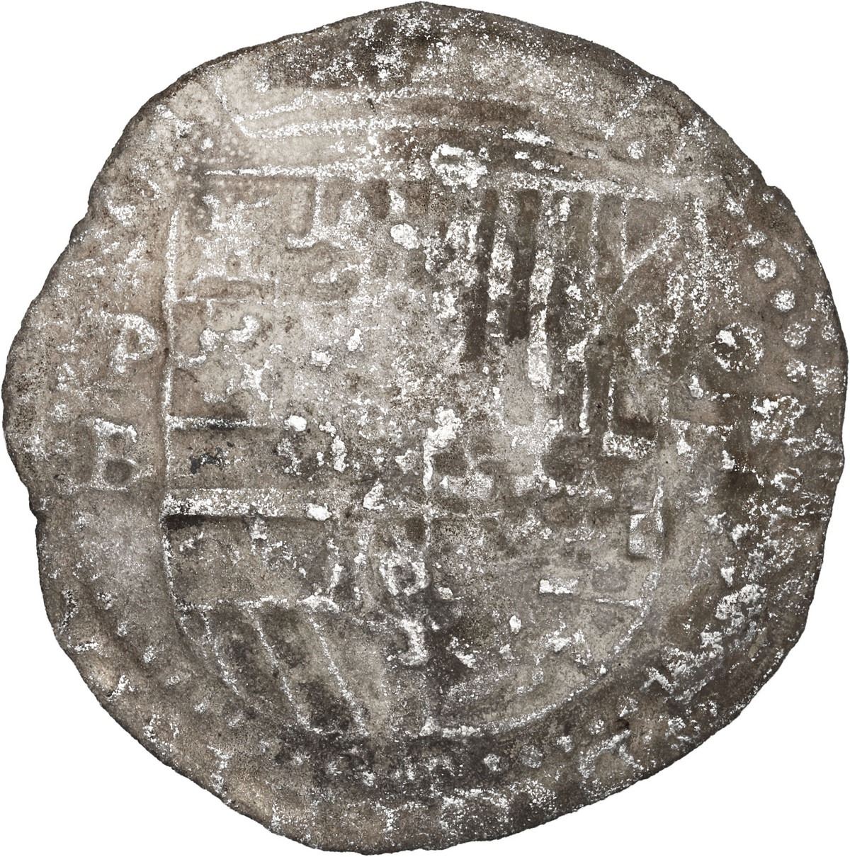 BOLIVIA, Potosí, cob 8 reales, Philip II, assayer B (4th period). S-P12; KM-5.1; Cal-672. 22.02 grams. Corroded yet solid piece with clear mintmark and assayer to left of full shield, nearly complete cross with partial legends. From the Santa Margarita (1622), with original cardboard holder hand-marked 91 (registered in Fisher database in 1983 as 91-1, certificate missing).