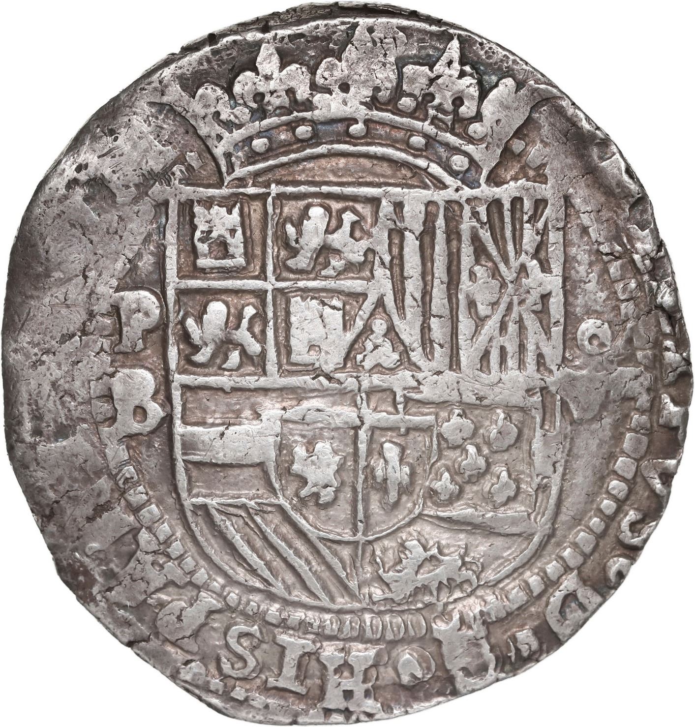 BOLIVIA, Potosí, cob 8 reales, Philip II, assayer B (5th period, early style). S-P14; KM-unl (5.1 for type); Cal-672. 27.29 grams. Broad flan for the period with full crown and much bold legend, the shield very bold and well detailed but the full cross somewhat doubled, bold P-B, interesting unique variety with five fleurs in an X shape in the shield, AXF with nice toning.