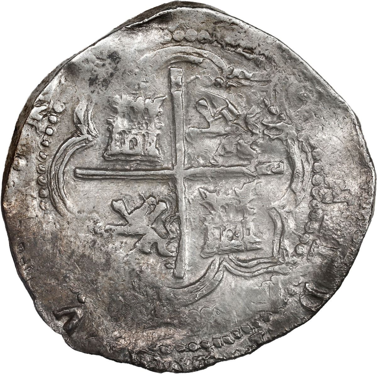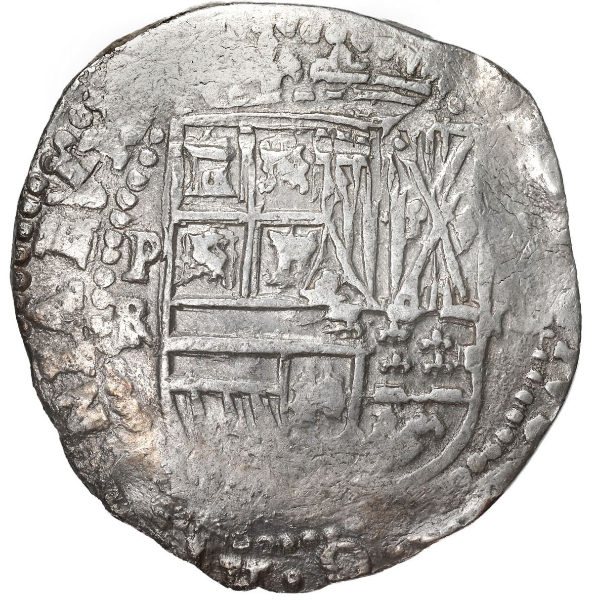 BOLIVIA, Potosí, cob 8 reales, Philip II, assayer RL. S-P13; KM-5.1; Cal-675. 27.04 grams. Broad-flan XF+ with peripheral flatness and porosity (partially lightly toned) but well-detailed full interiors including a bold full P-RL.