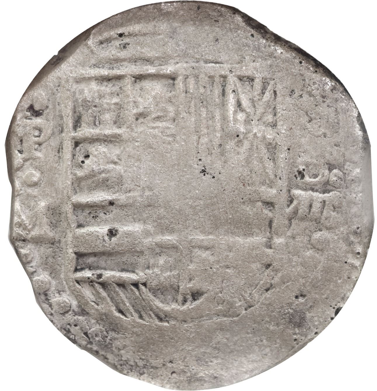 BOLIVIA, Potosí, cob 8 reales, Philip III, assayer M, Grade 2, NGC / shipwreck effect (São José Shipwreck Label). S-P18; KM-10; Cal-919. Nearly full shield and cross with weak centers, bold mintmark and assayer, dull gray-toned surfaces with minor corrosion (better than typically seen from this wreck). Recovered from: São José, sunk in 1622 off Mozambique, east of Africa
