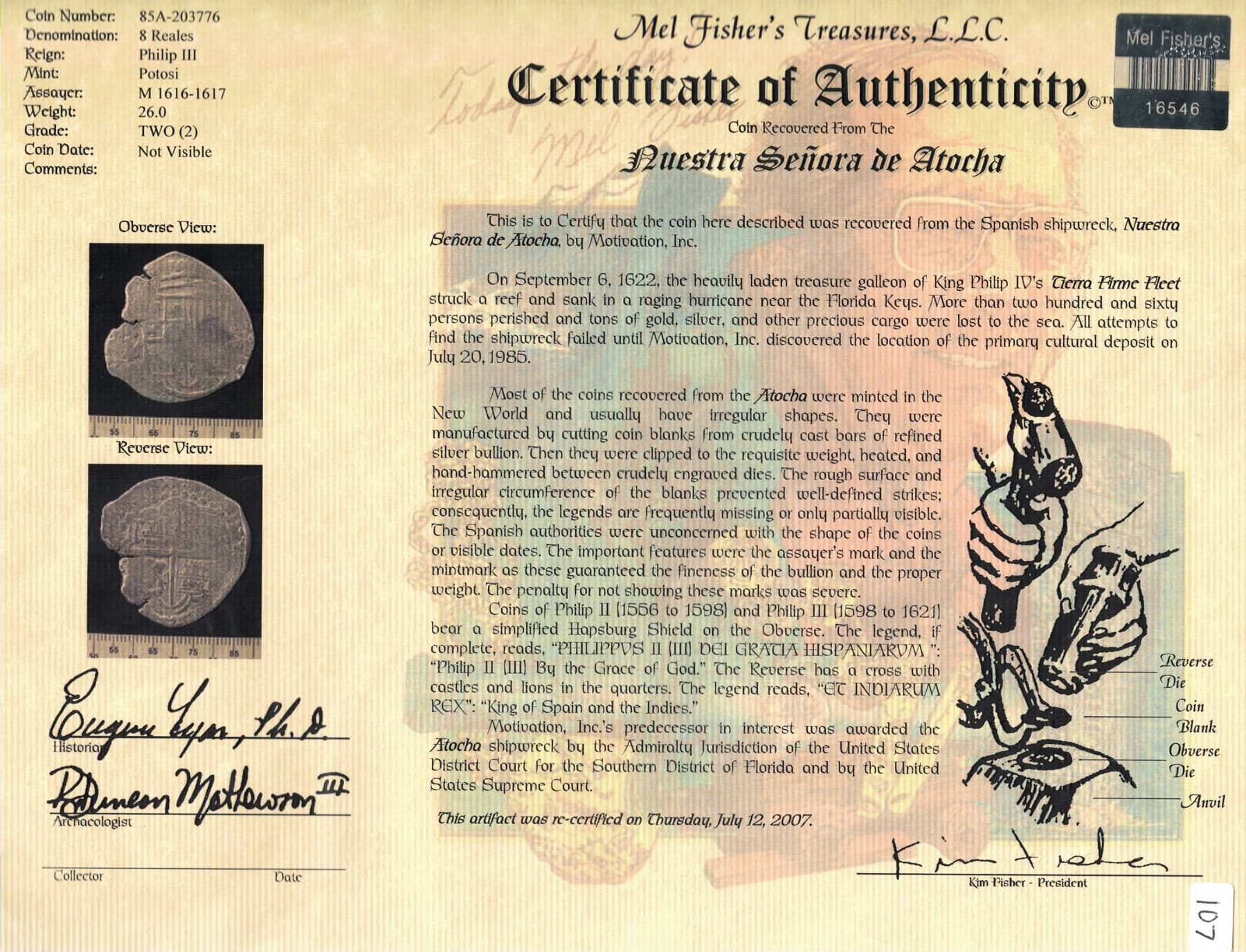 BOLIVIA, Potosí, cob 8 reales, Philip III, assayer M/Q, Grade 2. S-P18; KM-10; Cal-918. 26.03 grams. Solid but out-of-round and unevenly thick (as made), with bold assayer M (under-assayer Q rather weak, not mentioned on certificate), full but softly struck shield and cross, minimal surface corrosion. With Fisher tag and photo-certificate 85A-203776. Recovered from: Atocha, sunk in 1622 west of Key West, Florida