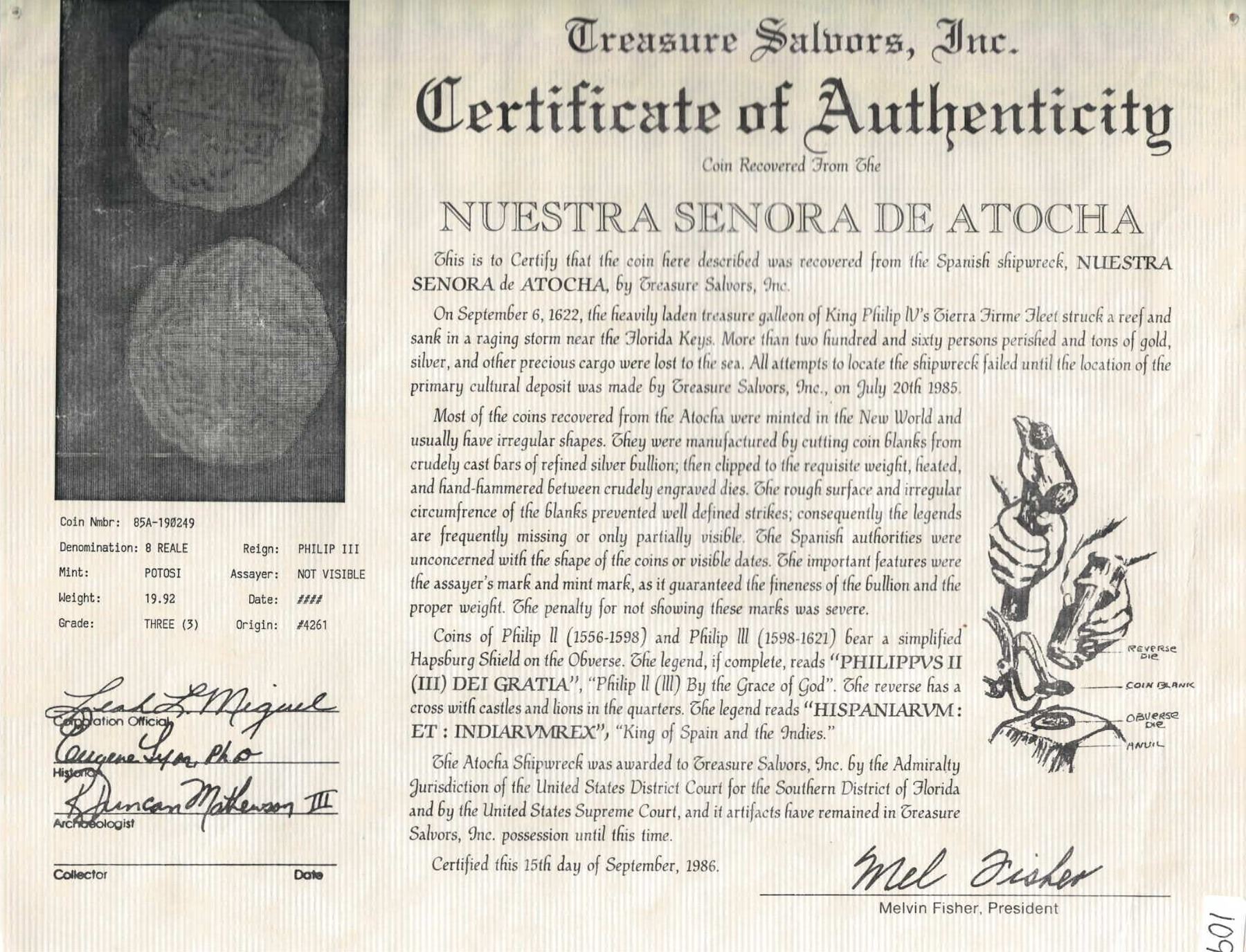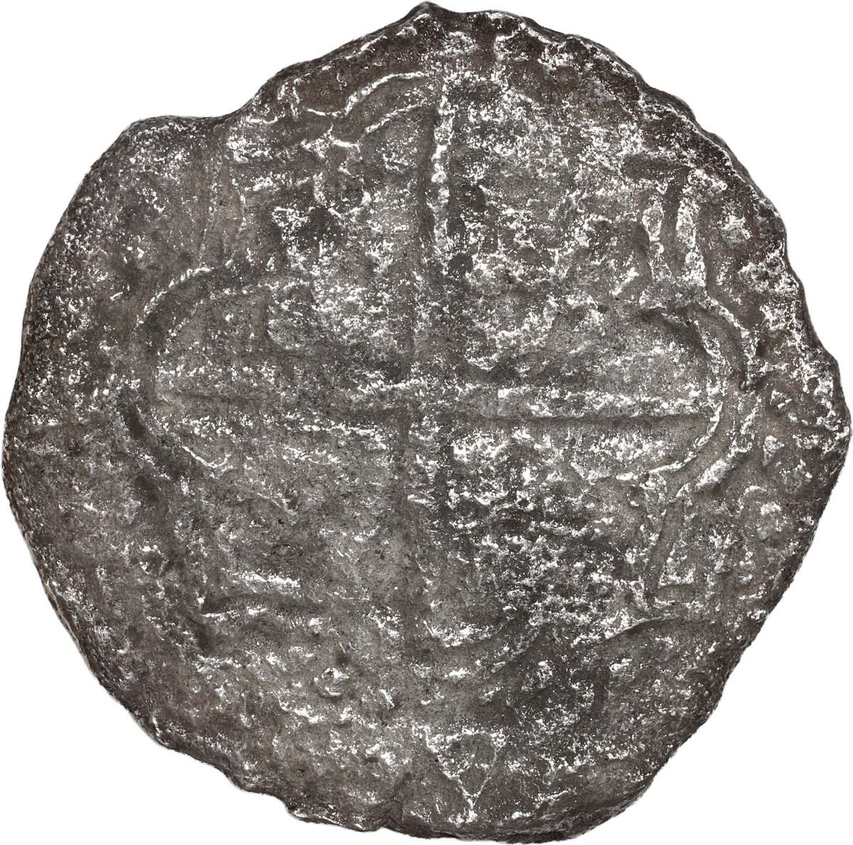 BOLIVIA, Potosí, cob 8 reales, Philip III, assayer M (pre-dated type), Grade 3. S-P18; KM-10; Cal-919. 19.96 grams. Good full shield and cross despite moderate corrosion all over, bold denomination O-VIII, lightly toned. With original Fisher certificate 85A-190249 (tag missing). Recovered from: Atocha, sunk in 1622 west of Key West, Florida