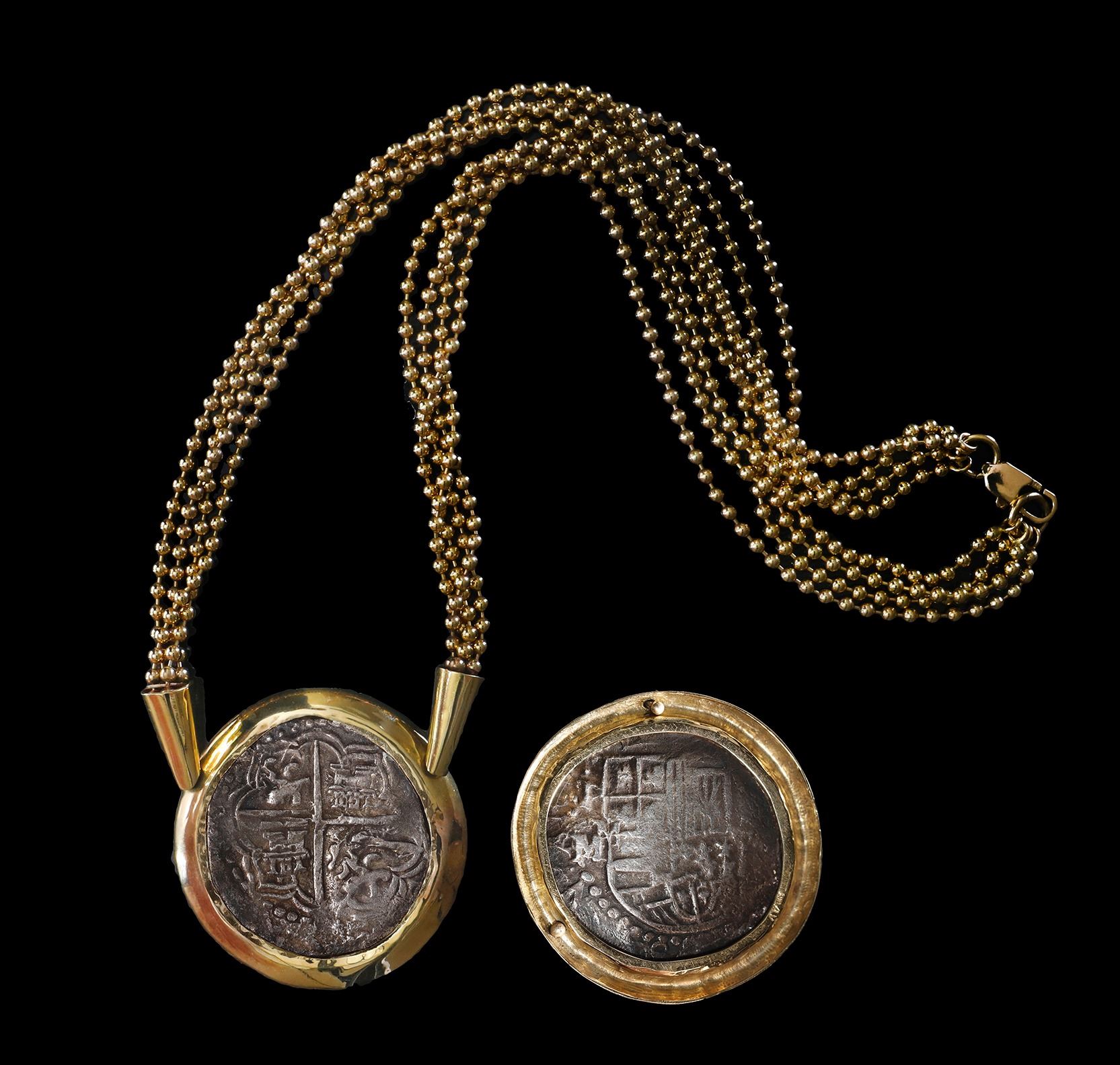 BOLIVIA, Potosí, cob 8 reales, Philip III, assayer M (pre-dated type), quadrants of cross transposed, Grade 2, ex-Atocha (1622), mounted cross-side out in unique (custom) 18K gold bezel incorporated with 14K gold chain. 93.68 grams total. Bold statement piece with a wide wrapped gold bezel around a richly toned and choice coin with nice full cross (though mounted upside down) showing off transposed quadrants, a complete yet doubled shield showing on the other side with clear mintmark P over doubled M assayer, the coin and bezel attached to a gold four-strand beaded chain with clasp at top. From the Atocha (1622), with original Fisher certificate 85A-215103 (tag missing).