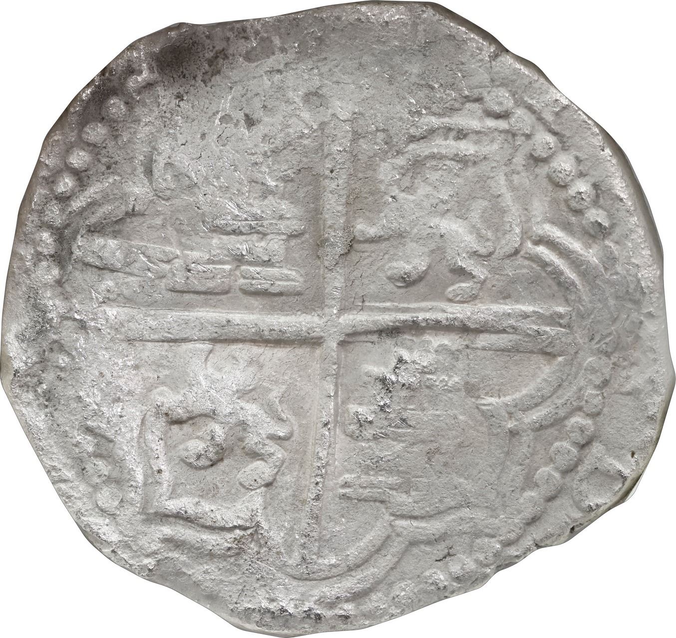 BOLIVIA, Potosí, cob 8 reales, Philip III, assayer Q, Grade 2, NGC / shipwreck effect (São José Shipwreck Label). S-P17; KM-10; Cal-916. Corroded shield side but with clear assayer, very nice full cross with just a little doubling. Recovered from: São José, sunk in 1622 off Mozambique, east of Africa
