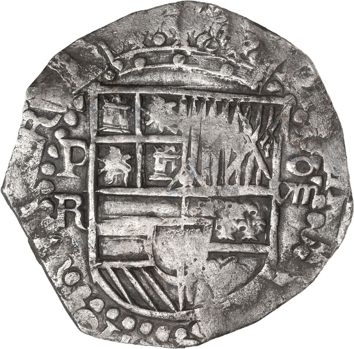 BOLIVIA, Potosí, cob 8 reales, Philip III, assayer R (curved leg), ex-Rosenheim. S-P15; KM-10; Cal-912. 27.36 grams. Broad flan with very bold full P-R and denomination o-VIII flanking a choice full shield below nearly full crown, good full cross (slightly doubled), AXF with dark toning in crevices, a few light old scratches. Pedigreed to the Arturo Rosenheim Collection (Sedwick Auction 29, with original lot-tag 412).