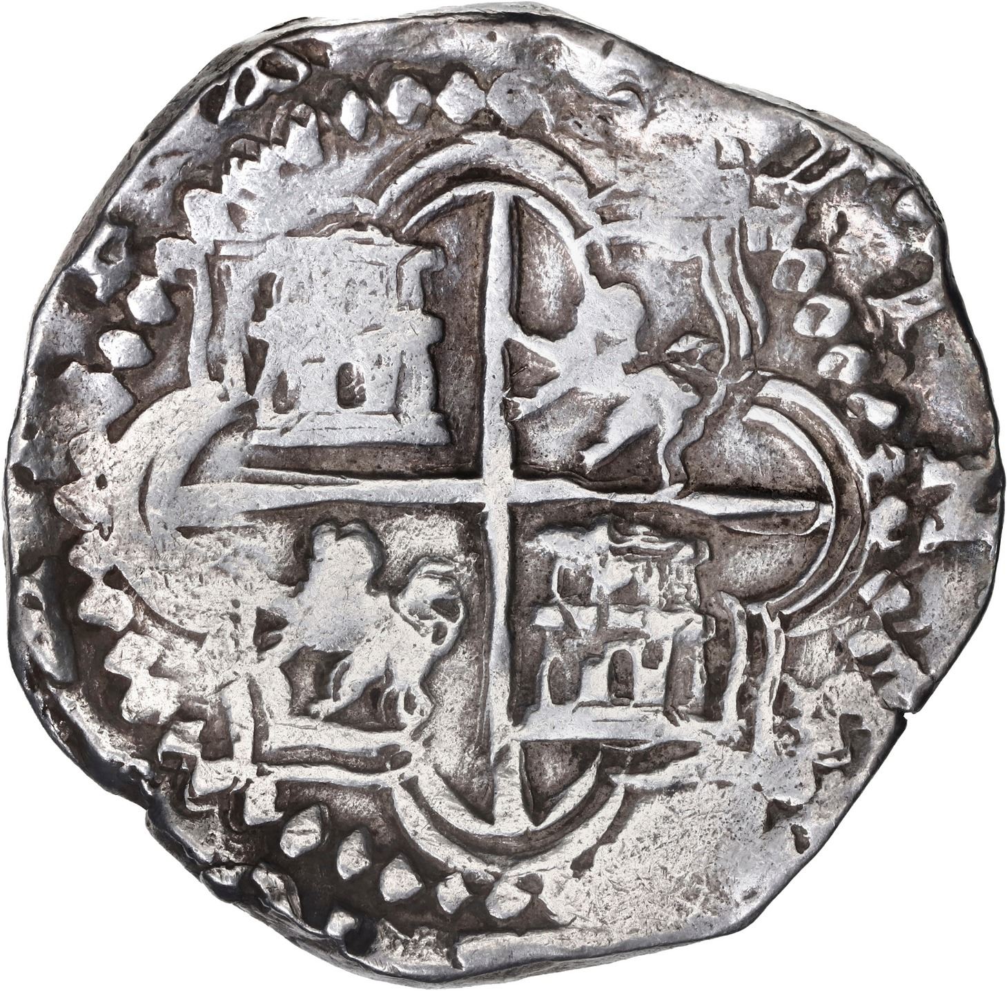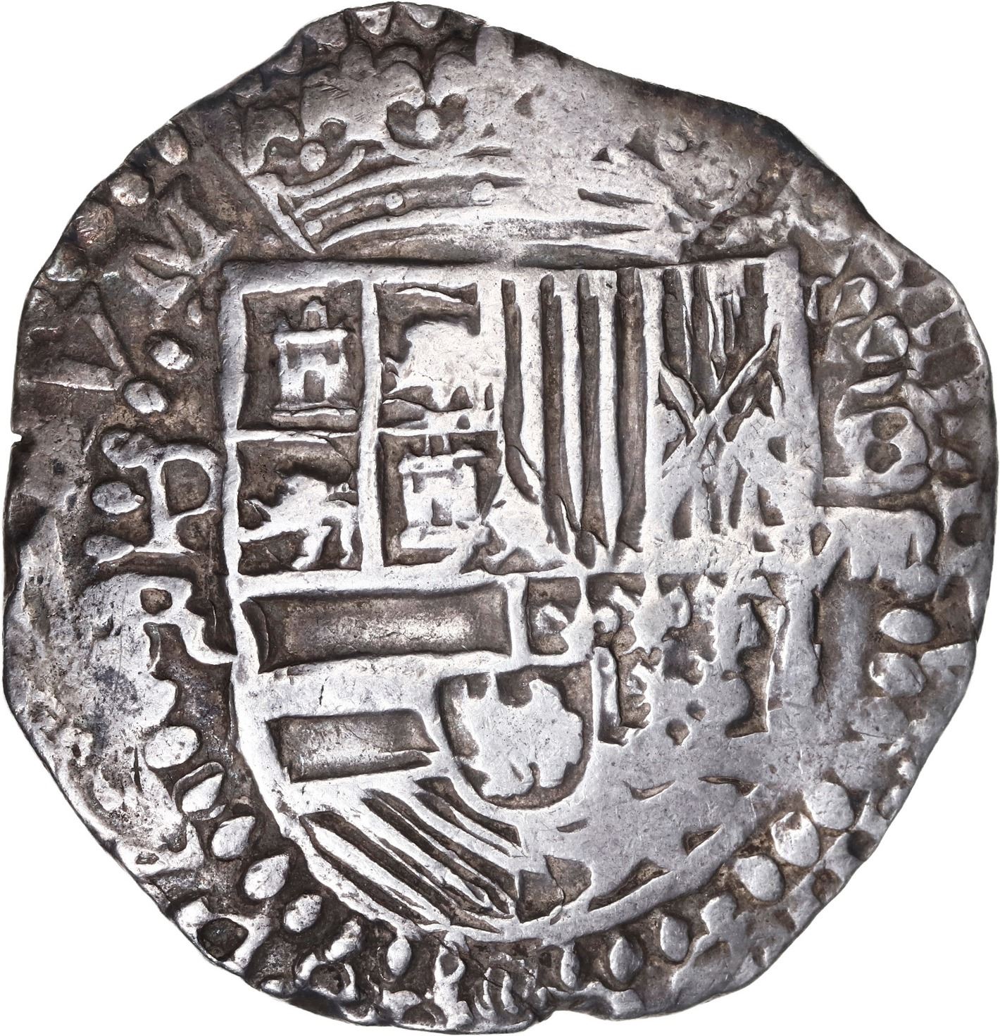 BOLIVIA, Potosí, cob 8 reales, Philip III, assayer R (curved leg). S-P15; KM-10; Cal-912. 26.67 grams. Bold VF with nice toning, great full shield with P-R to left and nearly full crown above, also good full cross-lions-castles. Pedigreed to the Coins & Antiquities, Ltd (Almanzar) auction of September 1986, with original lot-tag 115.