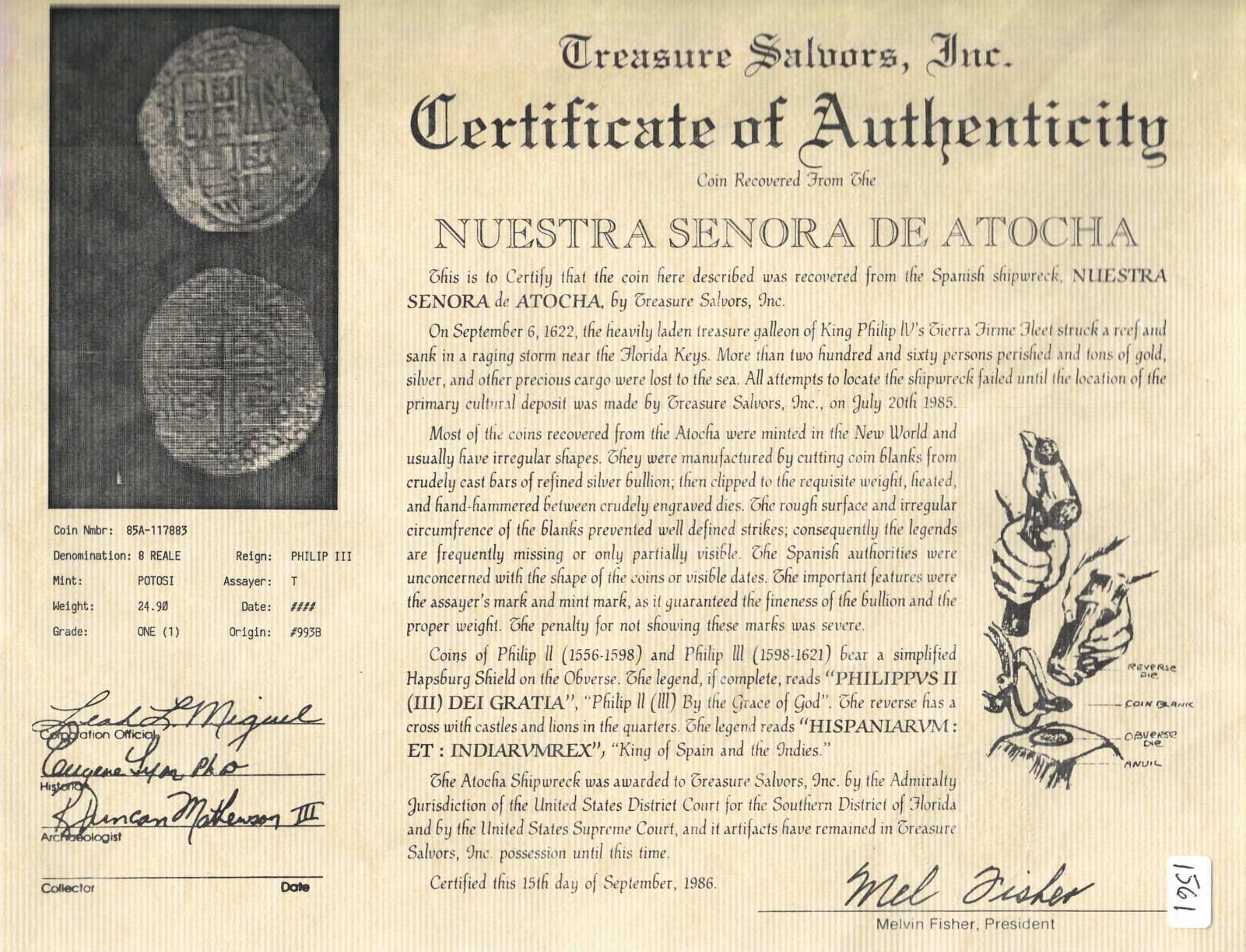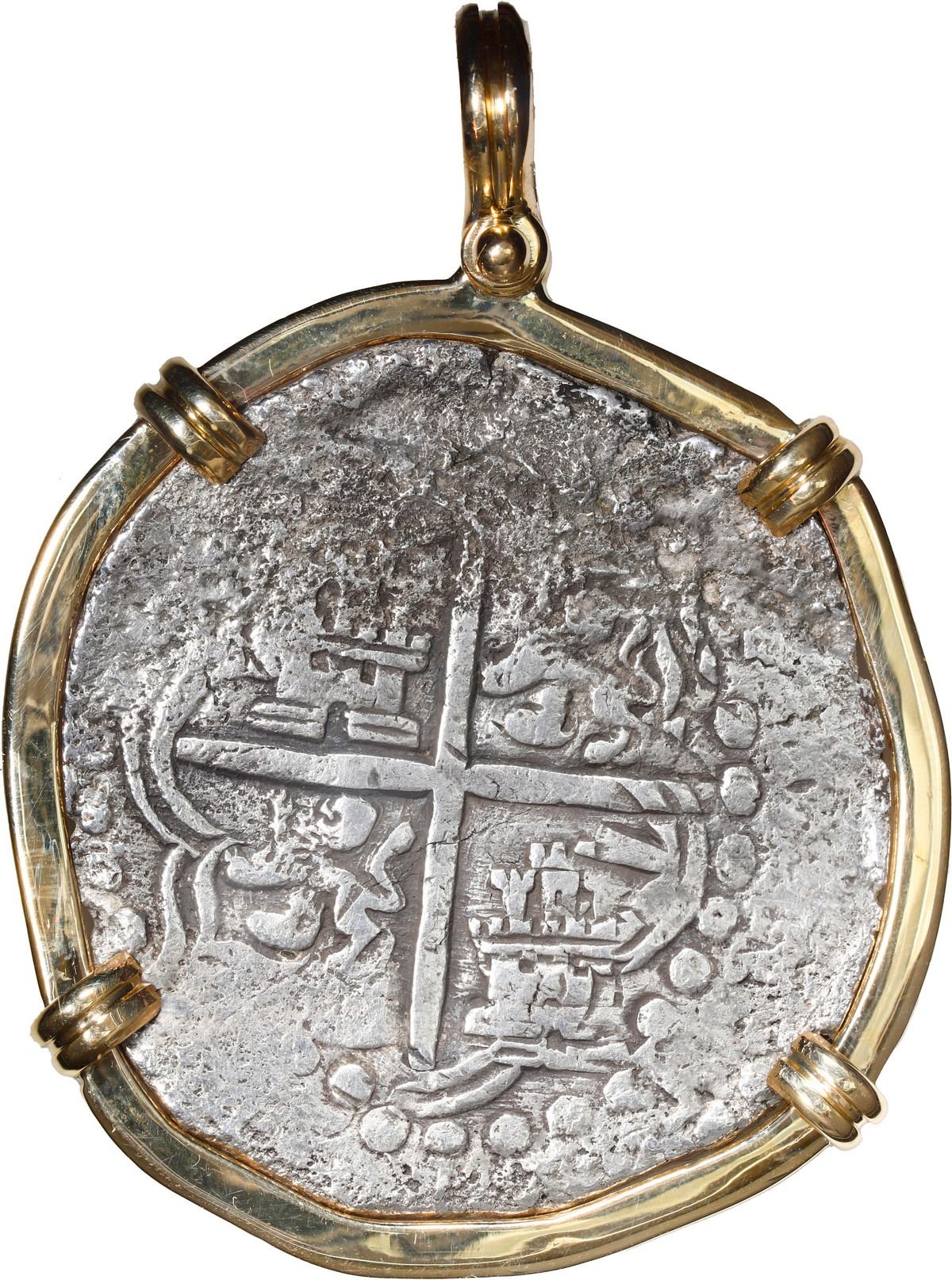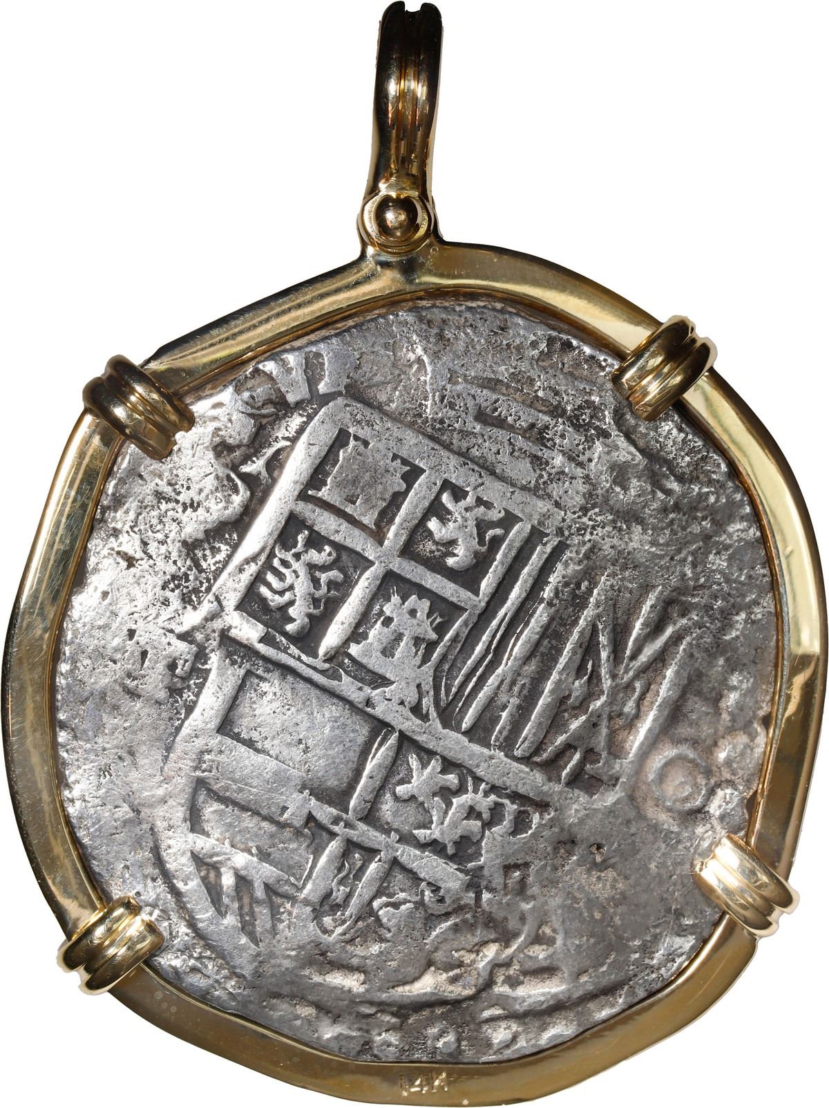 BOLIVIA, Potosí, cob 8 reales, Philip III, assayer T, Grade 1, ex-Atocha (1622), mounted cross-side out in 14K gold pendant with shackle bail. 33.23 grams total. Choice coin with nice full cross, the shield similarly well detailed and nearly complete with only a bit of doubling, assayer a bit weak but certain, custom-mounted with four prongs. From the Atocha (1622), with original Fisher tag and certificate 85A-117883.