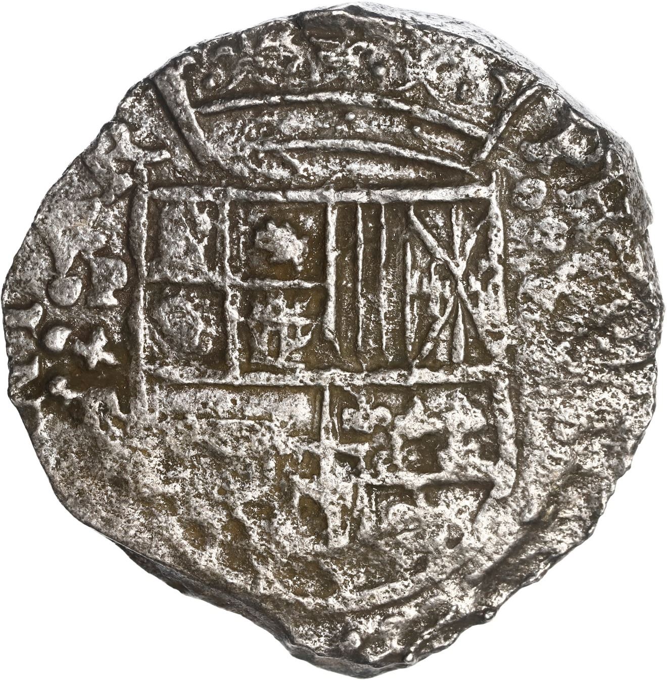 BOLIVIA, Potosí, cob 8 reales, Philip III, assayer T, partial date 162(?), "flat" lions, Grade 2. S-P21; KM-10; Cal-Type 165. 23.65 grams. Excellent full crown above well-detailed full shield, full cross with bold 6Z of date at top, nicely toned, some light surface corrosion. With original Fisher tag and certificate 85A-158138. Recovered from: Atocha, sunk in 1622 west of Key West, Florida