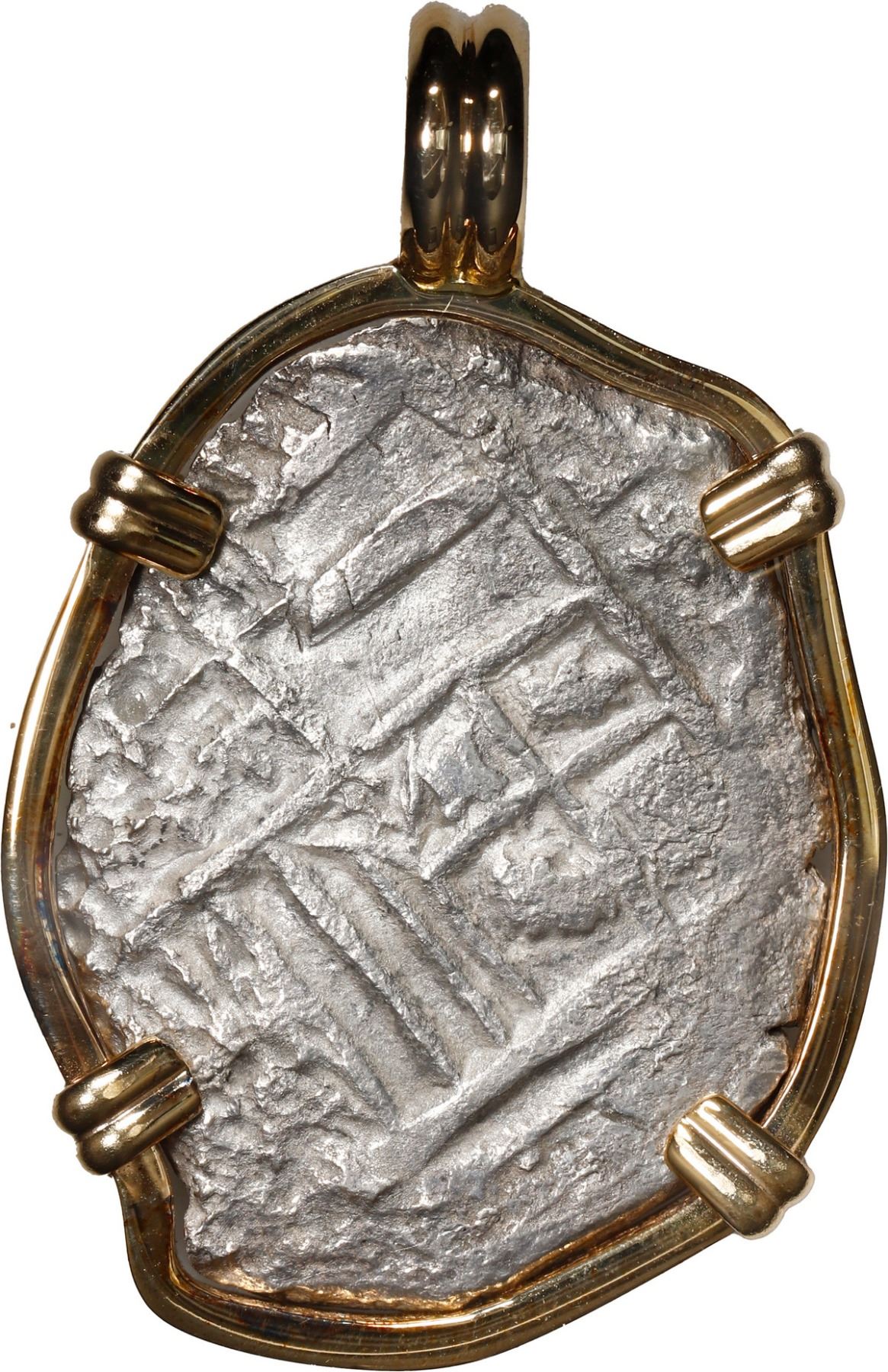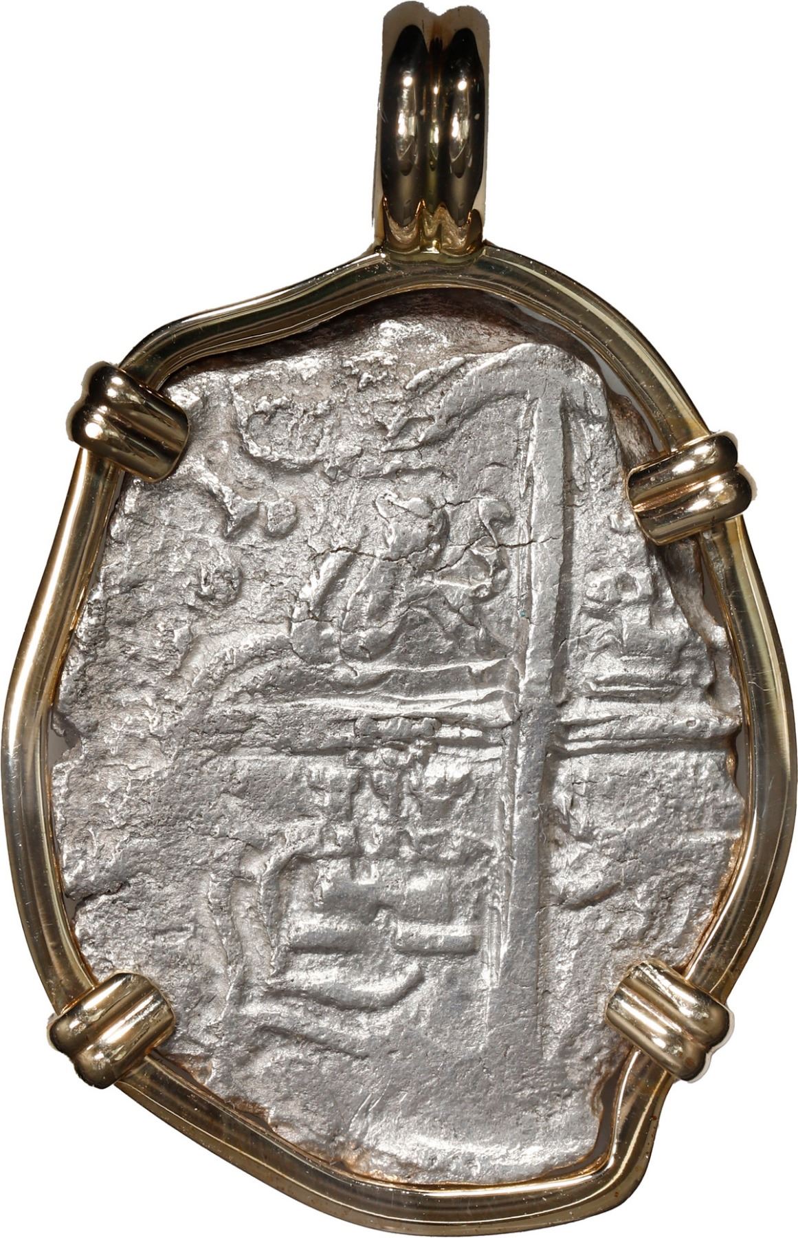 BOLIVIA, Potosí, cob 8 reales, Philip III, assayer T, quadrants of cross transposed, Grade 3, ex-Atocha (1622), mounted cross-side out in 14K gold pendant with fixed bail. 14.64 grams total. Silvery piece with some edge corrosion yet showing nice details in the partial cross and shield, assayer just visible along with partial date. (Note: Bezel weighs about 5.27 grams, given the coin's certified weight of 9.37 grams.). From the Atocha (1622), with Fisher tag 85A-132289 (certificate missing).